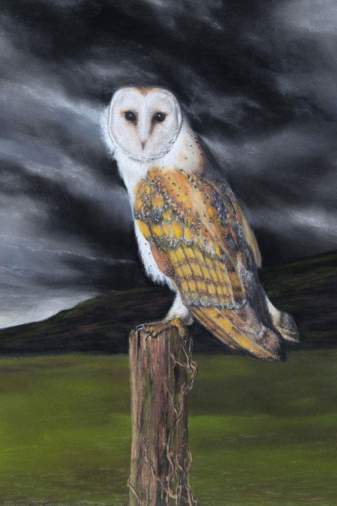 Limited edition giclée print of a pastel painting of a barn owl sitting on a pole, set against a far away landscape under a dark sky