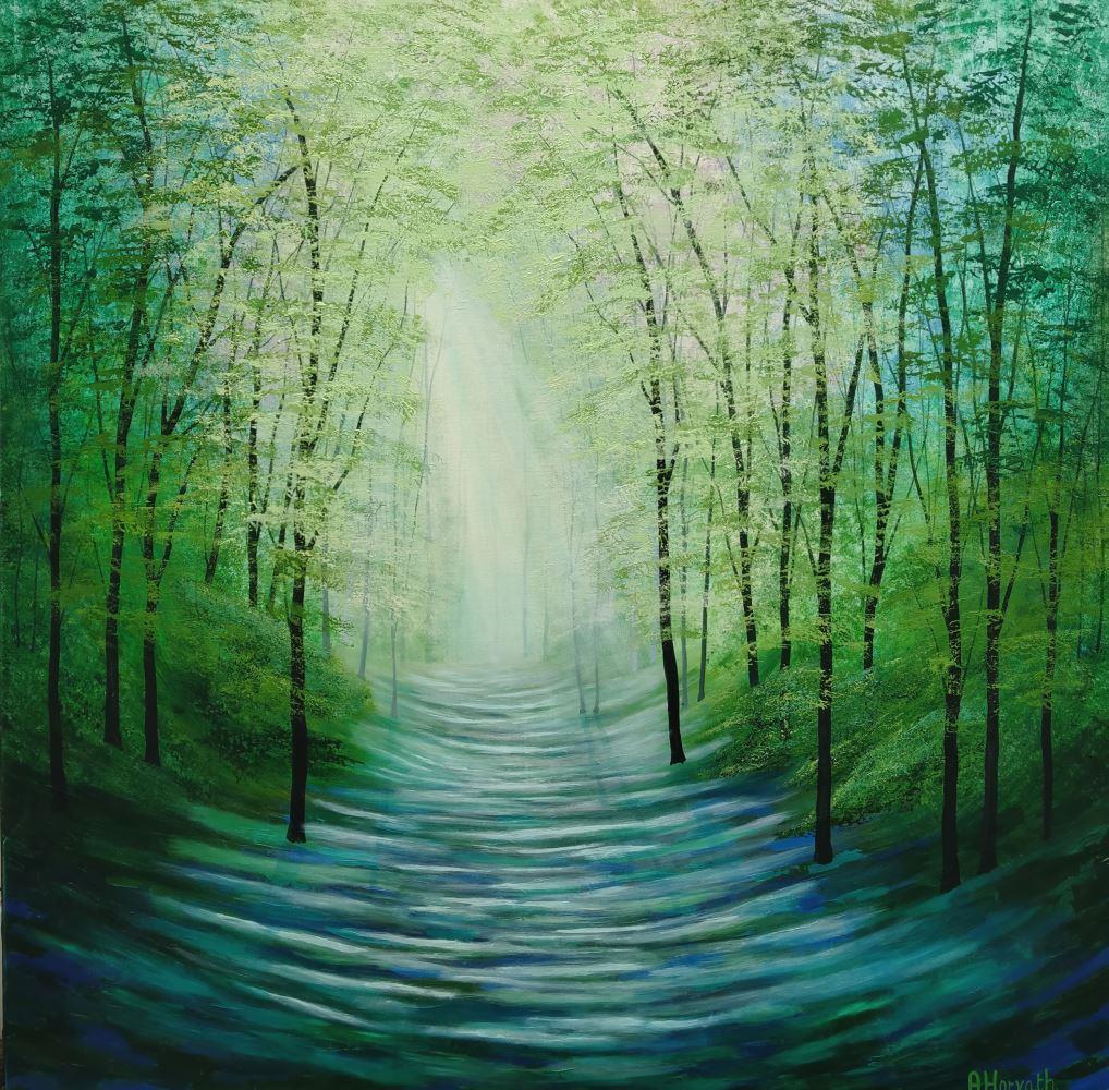 "Sunlight Serenade Forest Glade" invites you on a tranquil walk through a peaceful woodland, where golden rays filter gently through the trees, illuminating a quiet clearing touched by distant summer light. The forest exudes an ethereal calm, bathed in soft greens and soothing blues. This painting is an invitation to go forest bathing — a meditative journey into a sylvan dream.