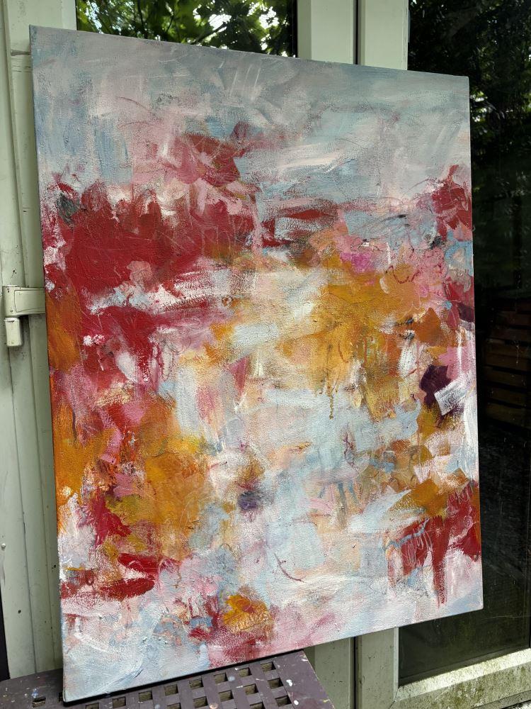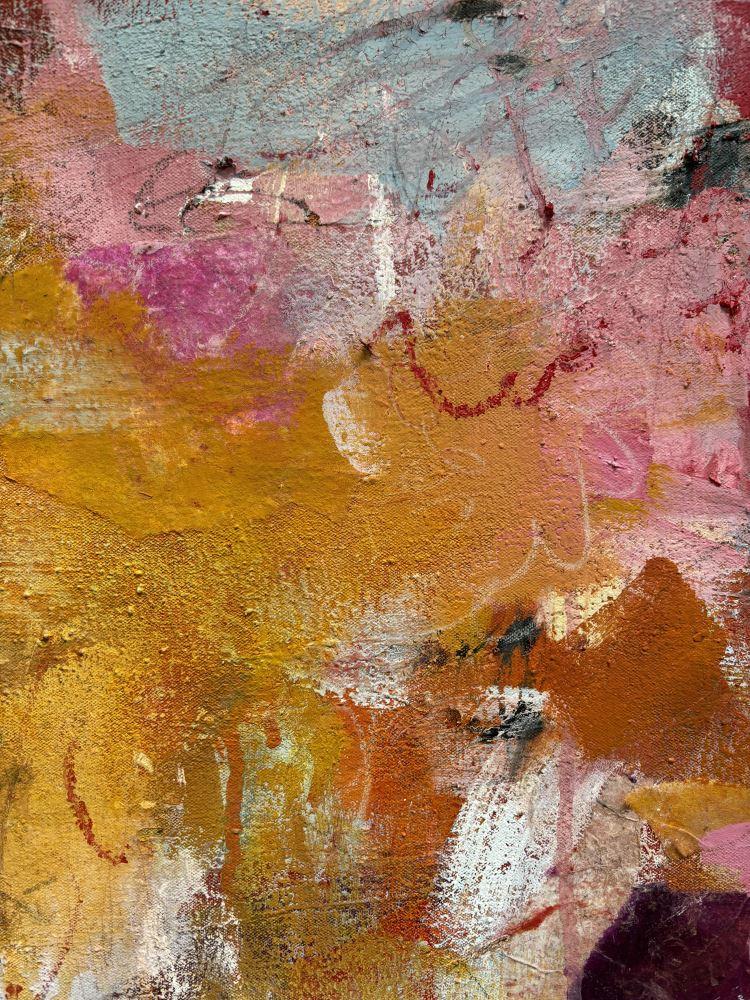 This joyful piece will add a touch of warmth to any space. With its soft colour scheme of pinks and yellow ochre, layers of brush strokes and other mark making, 'Into the Playground' captures a mood of ease, fun and sweetness. The painting was created using artist pigments, acrylic, ink, paper, and pencil on canvas. The artist's own paint recipe is used resulting in a high level of pigmentation that brings the artwork to life.