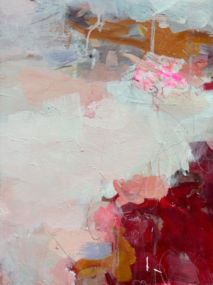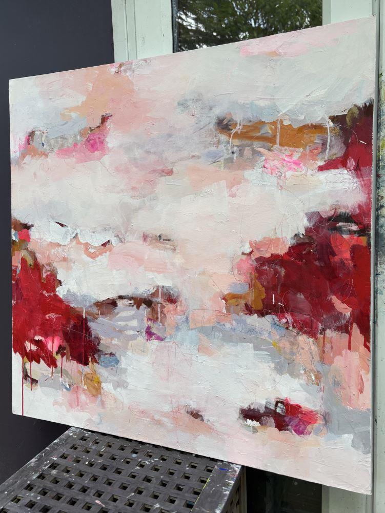 This lyrical, abstract painting was inspired by an exploration of the theme of love. With 'Speaking From the Heart' I explore the theme of authenticity, openness and connection when we express ourselves in a way that opens us up to vulnerability. Tender as well as difficult feelings might be communicated to another person. The painting is inspired by the delicate feelings that this kind of conversation evokes.
