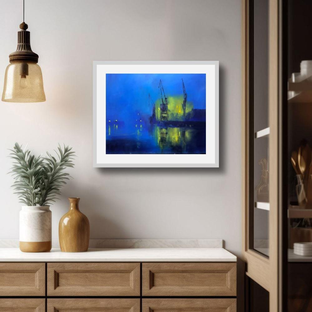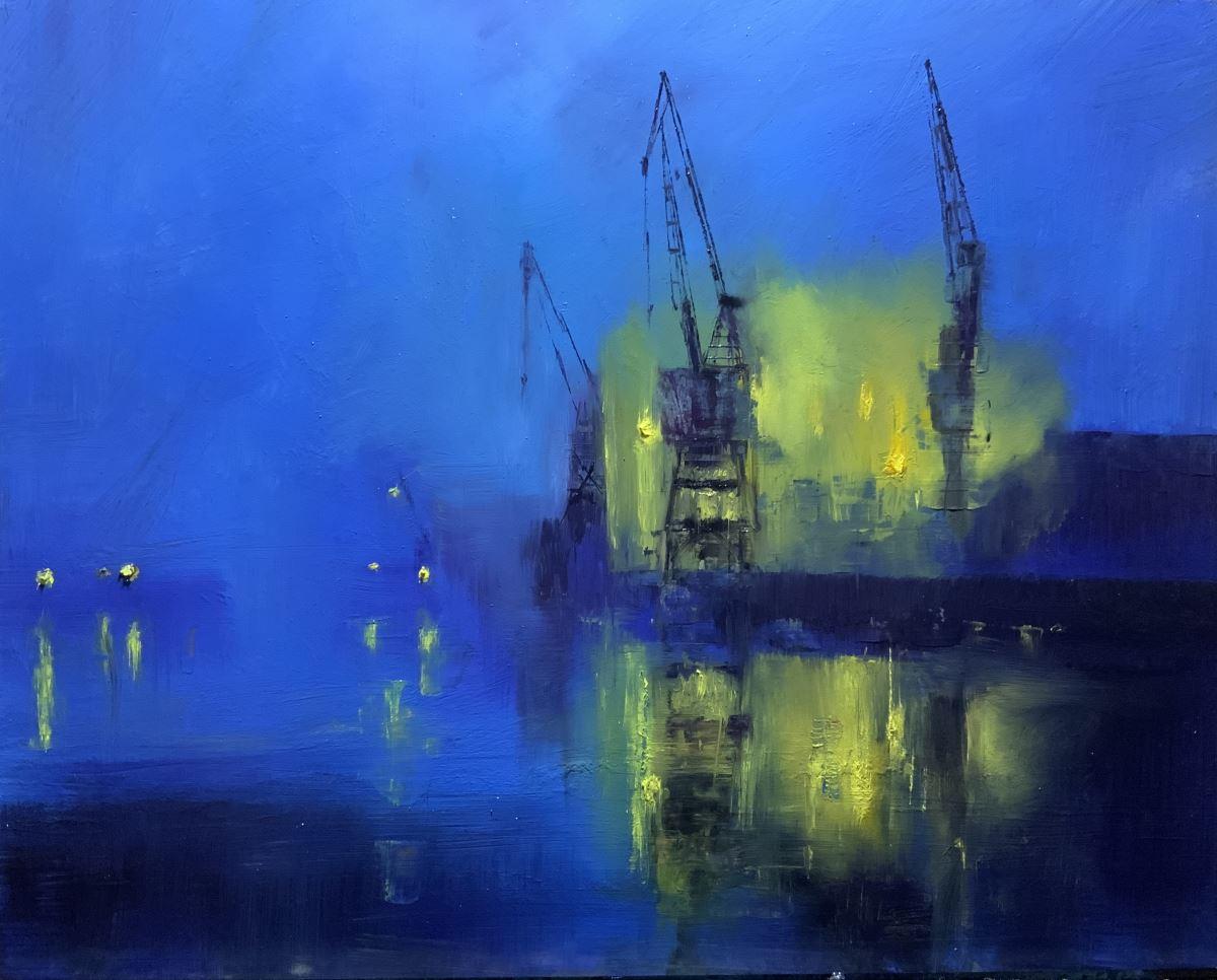 Structure and abstraction meet in this quiet, luminous meditation on a dockland waterfront at night. The first in a series of industrial nocturnes.