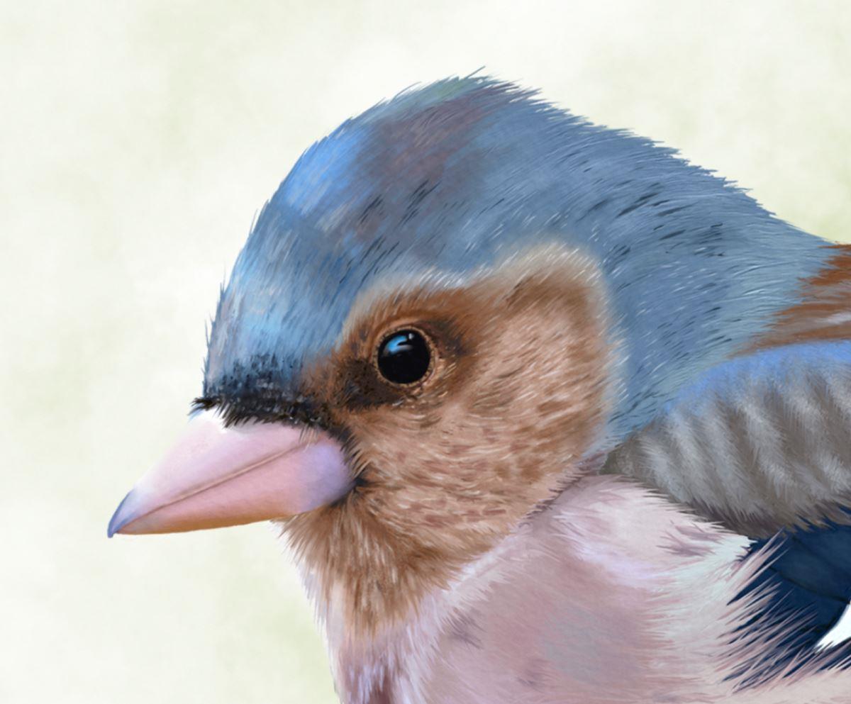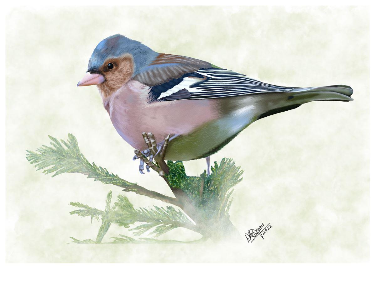 This artwork celebrates the beauty of the Chaffinch (Fringilla coelebs), one of the most widespread and colourful songbirds in Europe. Perched elegantly among evergreen foliage, the bird's rosy-pink breast and cheeks blend seamlessly into its slate-blue crown and nape, while bold black-and-white wing markings add striking contrast. The artist has captured the softness of the plumage and the bird's attentive posture with remarkable precision, creating a portrait that feels both lifelike and timeless.