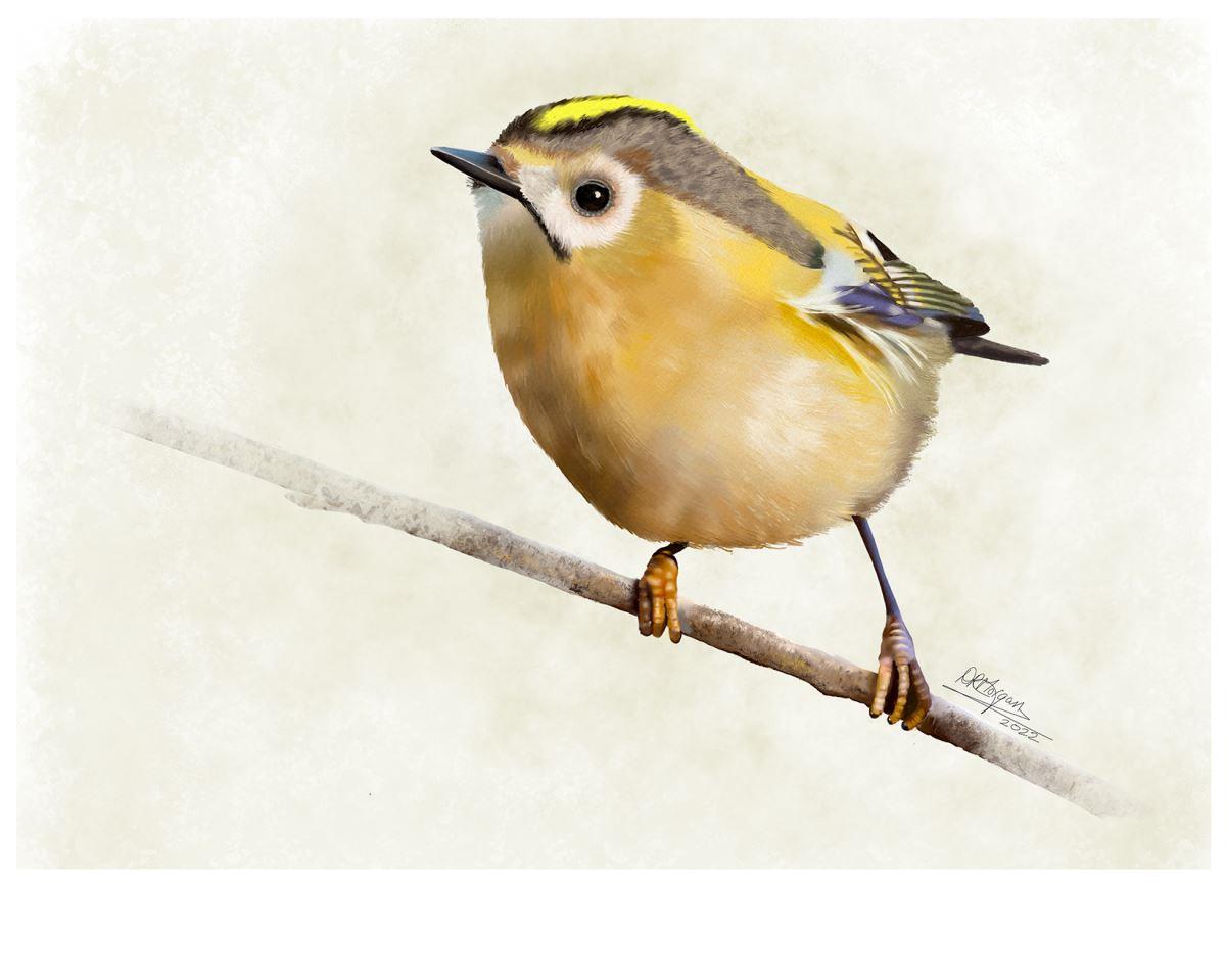 This exquisite artwork captures the delicate charm of the Goldcrest (Regulus regulus), Europe's smallest bird and one of the most enchanting visitors to our woodlands. Perched lightly on a slender branch, the Goldcrest is rendered with remarkable precision—its golden crown stripe edged with black, soft olive-green upperparts, and pale underparts all beautifully detailed.