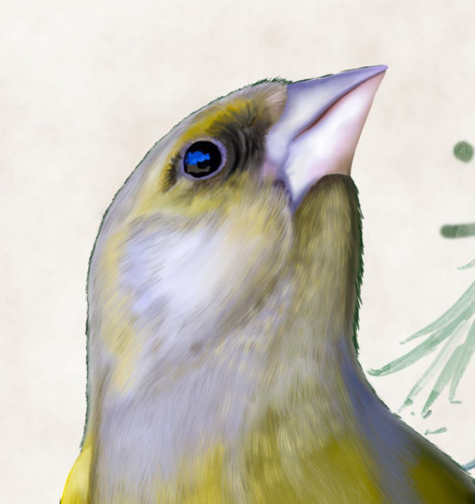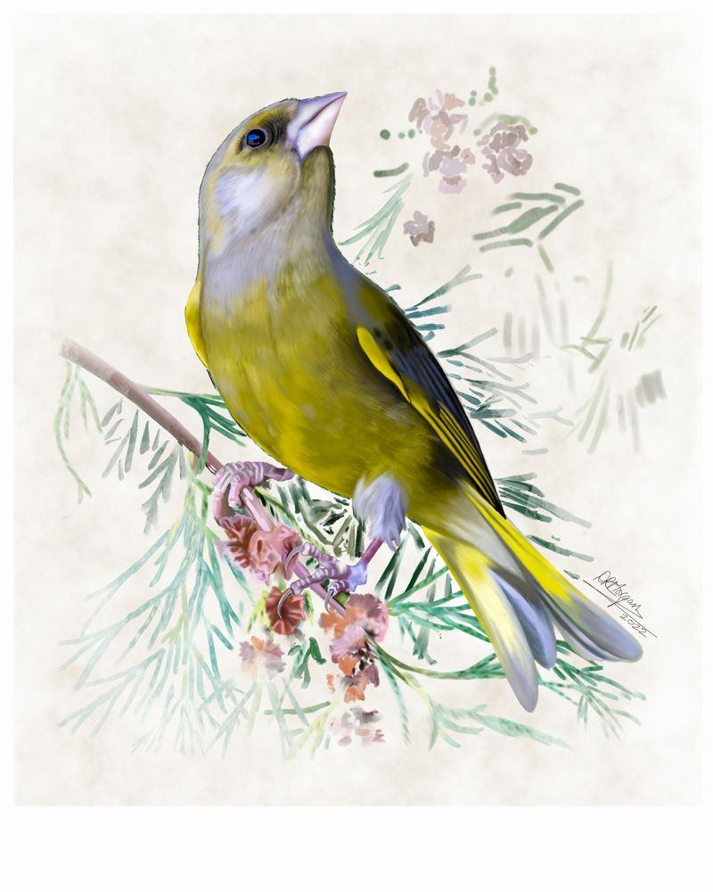 This artwork celebrates the bold colouring and character of the European Greenfinch (Chloris chloris), a familiar yet striking finch of gardens, woodlands, and farmland. Perched gracefully among delicate flowering foliage, the Greenfinch is shown in vivid detail: its bright yellow-green plumage, heavy finch bill, and subtle shading across the wings are brought to life with remarkable precision.