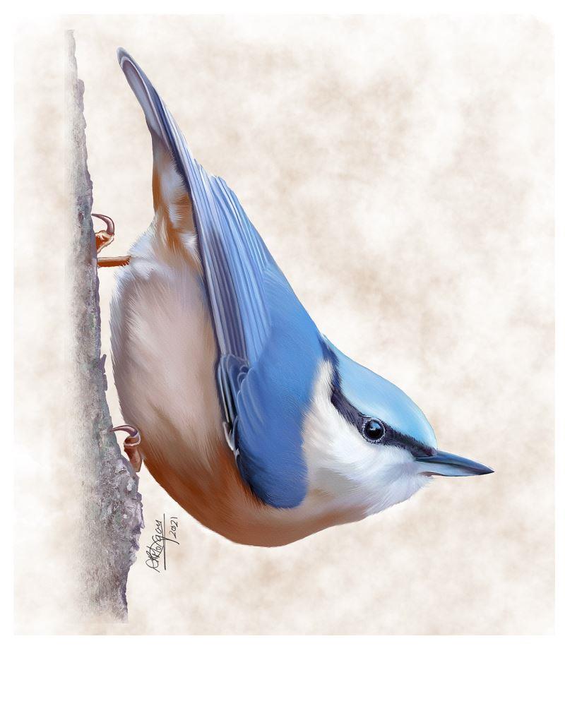 This striking artwork captures the lively character of the Eurasian Nuthatch (Sitta europaea), a familiar woodland bird instantly recognised by its bold colouring and distinctive posture.