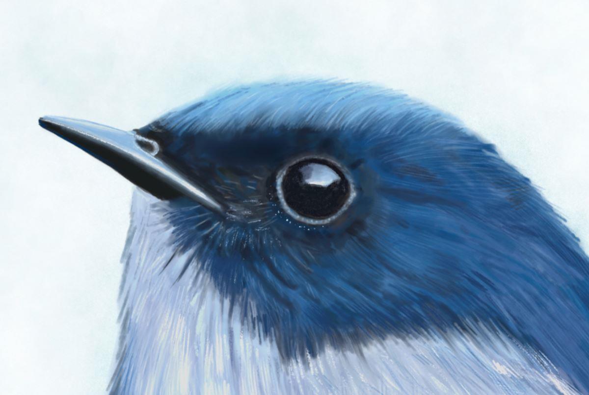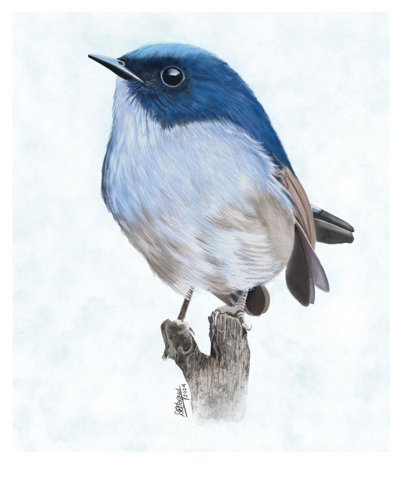 This artwork portrays the Slaty-blue Flycatcher (Ficedula tricolor), a delicate and enchanting songbird found across the forests and shrubby clearings of the Himalayas and Southeast Asia. Perched lightly on a weathered branch, the bird's velvety slate-blue head, wings, and back contrast with the soft icy blues and pale underparts, creating a striking balance of strength and gentleness.