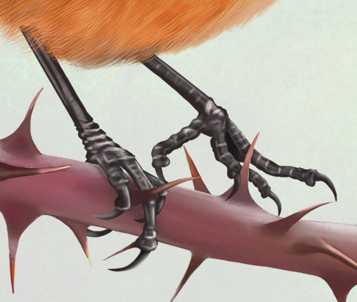 The contrast of its bright plumage against the sharp thorns reflects both the fragility and resilience of wildlife.