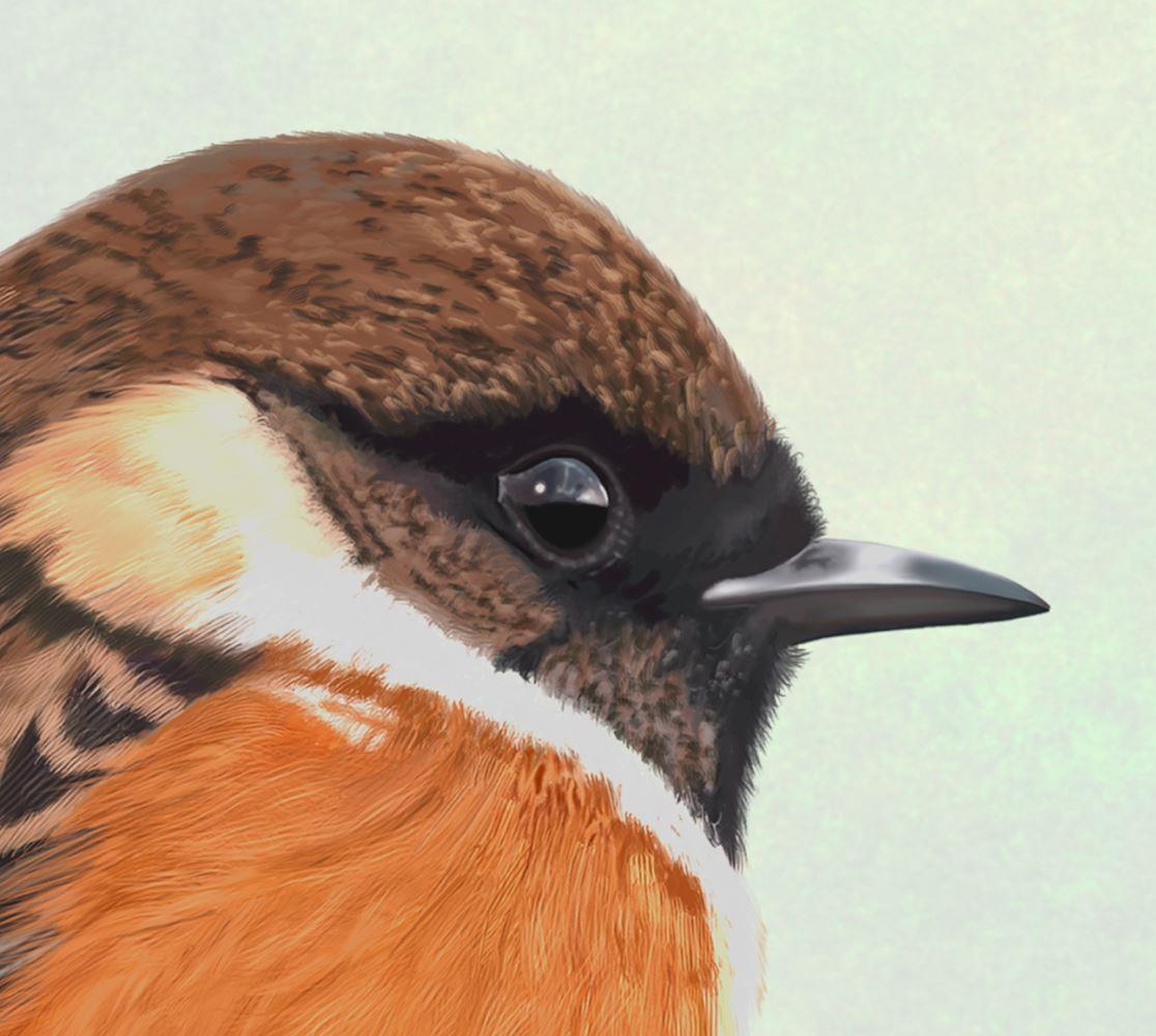 Delicately poised on a thorny branch, the Stonechat is captured here in all its vibrant beauty. Its burnt-orange breast, crisp white markings, and finely patterned wings are rendered with exquisite detail, set against a soft, atmospheric background that enhances the bird's natural elegance.
