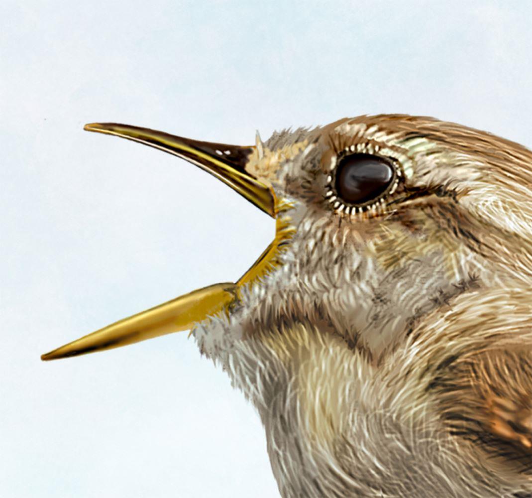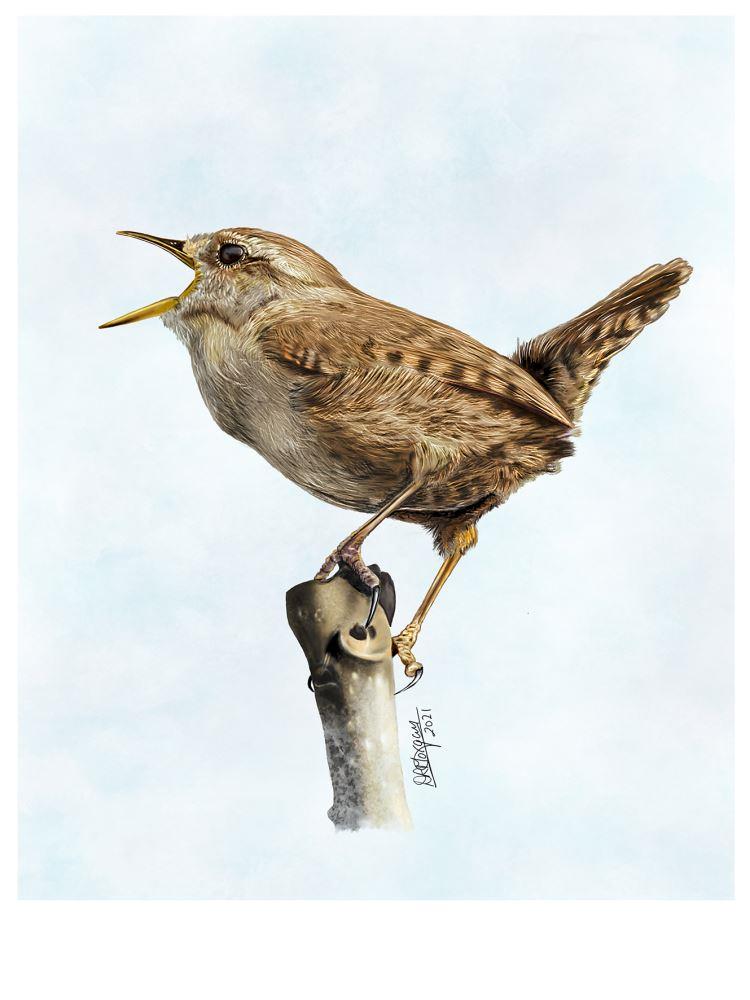 The Eurasian Wren (Troglodytes troglodytes) is a tiny bird with an enormous voice, often heard long before it is seen. Despite its small size, it sings with remarkable power, filling hedgerows, gardens, and woodland edges with bright, cascading notes. Here it is depicted mid-song, tail characteristically cocked, perched lightly as if commanding the stage.