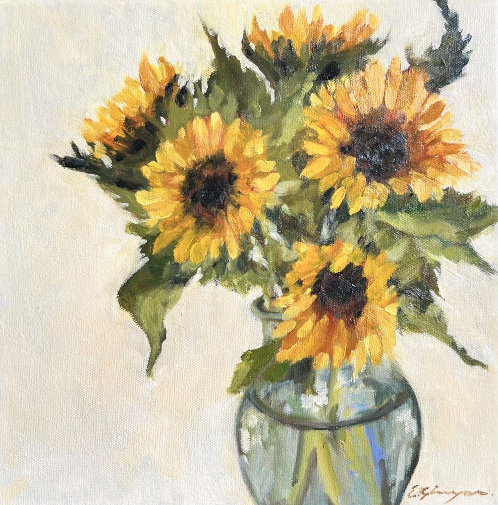 Still life painting painted in my studio of sunflowers in my glass vase. I really enjoy the study of the flowers and those yellow colour mixes. One of my favourite flowers, reminding me of summer.