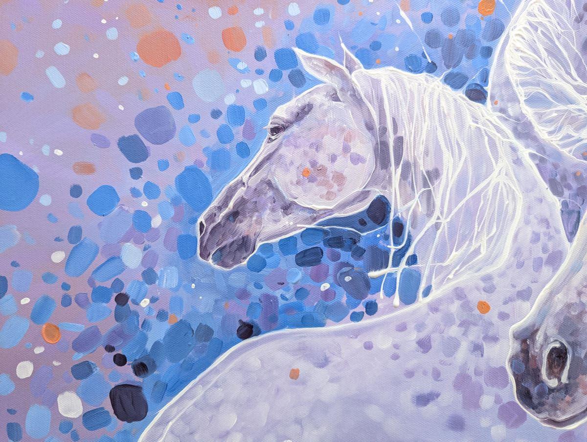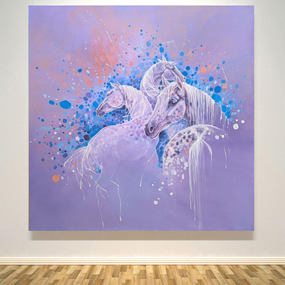 A Symphony of horses is a semi-abstract oil painting of three Arabian horses. It is 36x36x1.5 inches. The three pale dappled horses are positioned in the centre of the canvas with one looking questioningly back at the viewer and the other two looking right and left. The background is purple and the horses are pale whites and greys with dots and flashes of orange making interesting contrasts. The inspiration for it was simply a celebration of the beauty of horses and these horses are moving as if part of a dance or to some kind of equine symphony. They are going somewhere and the invitation is to follow… Painted on deep edge canvas, edges purple, ready to hang and comes with certificate of authenticity.