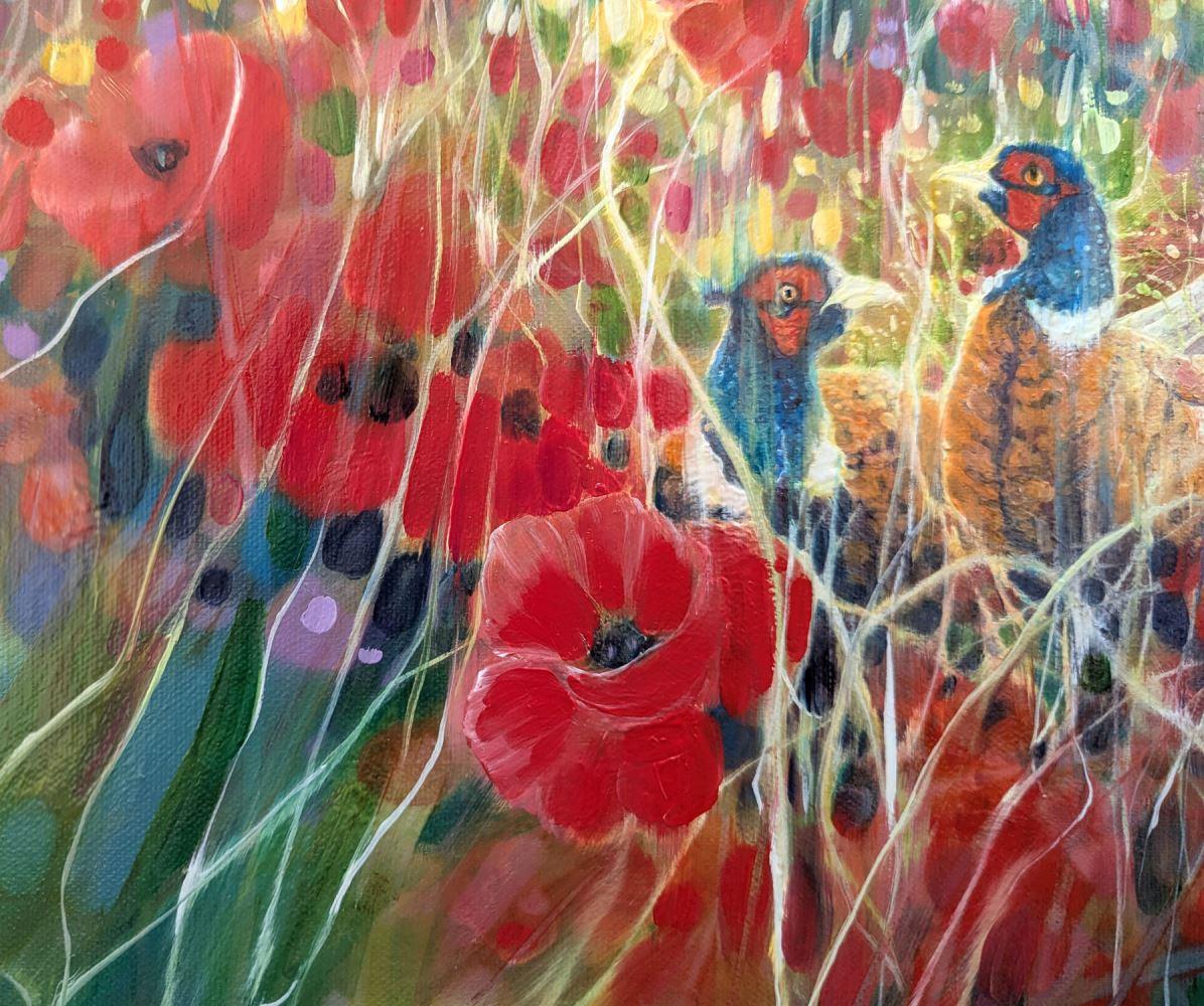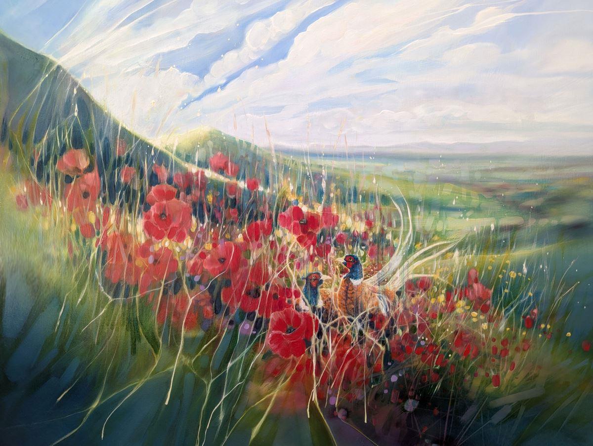 A Timeless Magic is a semi-abstract South Downs inspired landscape painting with red poppies and pheasants. It is 36x36x1.5 inches. The painting pays tribute to my many walks up and down the hills of East Sussex which is always breath-taking. This spot is near Ditchling and was made mostly from my memory of a late summer afternoon walk. There is a timelessness to hills as they have not changed as much as the other landscapes of England have. Spotting pheasants among poppies was a beautiful thing to see and I am happy to have caught this moment in time. The various layers and paint glazes give the overall impression of this scene being realistic but also strange when you look closer. Painted on deep edge canvas, white edges, ready to hang and comes with certificate of authenticity