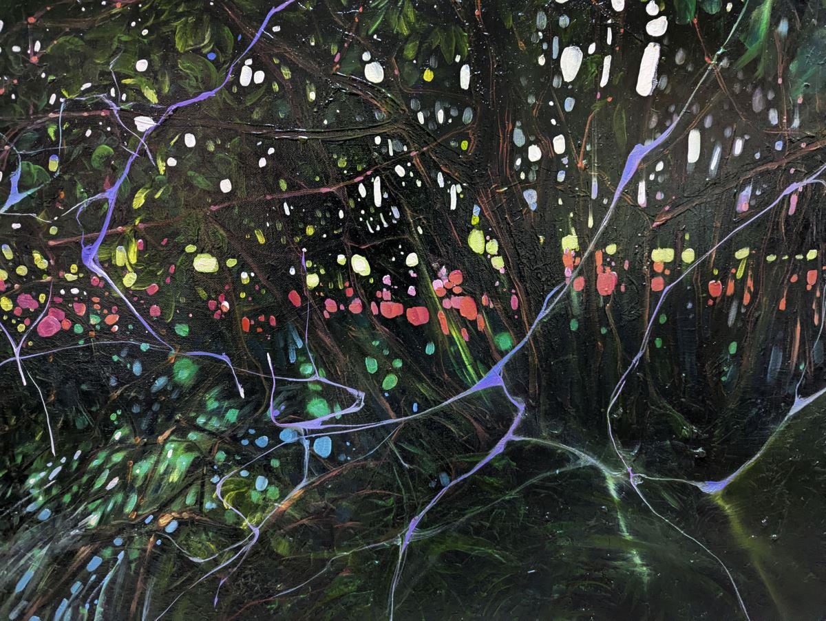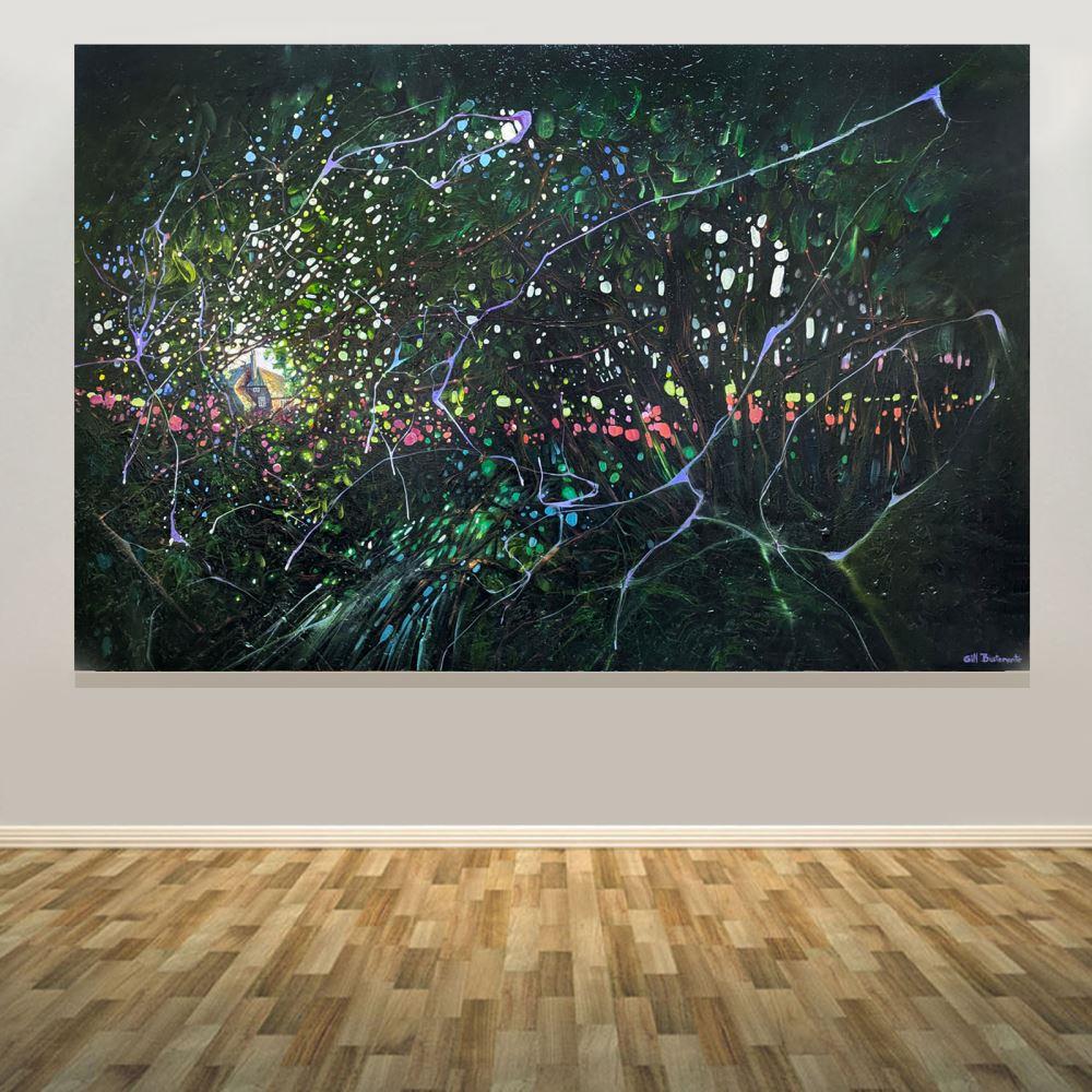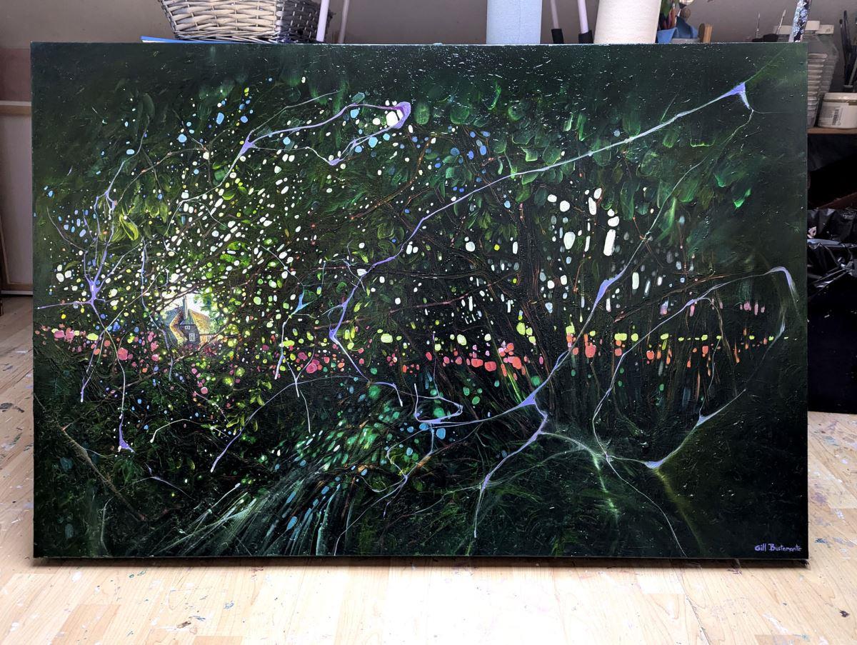 Dissolving Dream is a large textured abstract landscape oil painting about frustration and hope. It is 47x31x2 inches. The painting shows a dream house glimpsed through dark tangled trees. It is heavily textured in a dark iridescent green background. At first glance, it is completely abstract with lines and curves and spots of bright colour directing the eye around the painting. In one small section to the left, you can see an old English house with bright sunlight illuminating one side of it. There is also the hint of a stream and a field or flowers beyond. The painting represents a long-term dream of mine to live in a beautiful house in the countryside. I suspect the ship may have sailed on that dream so that is why it is both a hopeful painting and a wistful one. Painted on deep edge canvas, edges painted to match, ready to hang and comes with certificate of authenticity