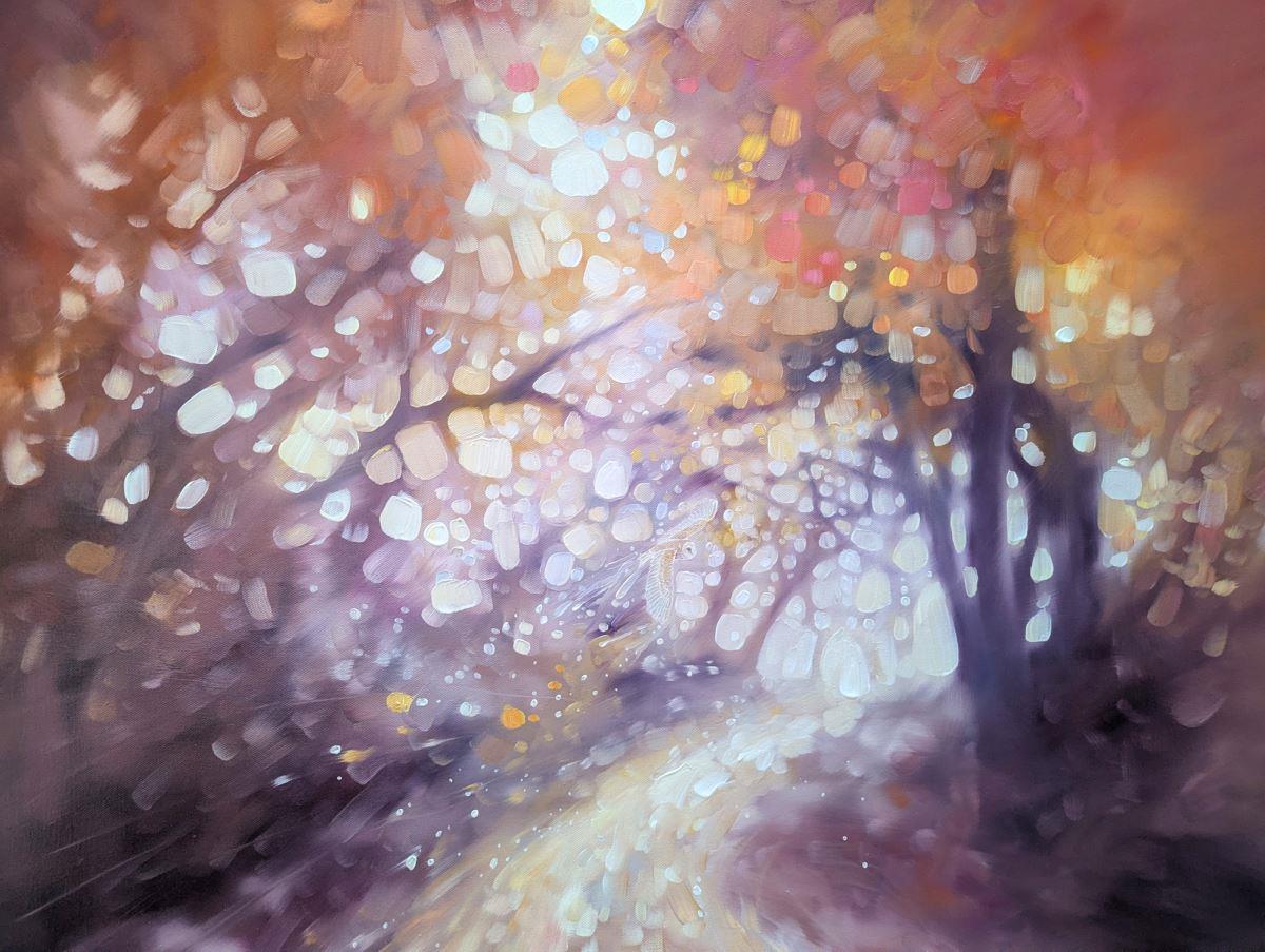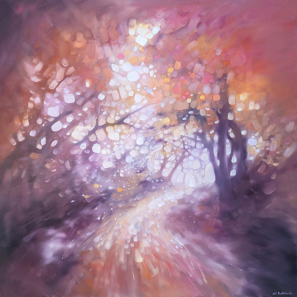 Hope Springs Eternal is a serene semi-abstract oil painting of an autumn woodland path with a barn owl in soft oranges, magentas and amethyst. It is 36x36x1.5 inches. The concept of this painting was to concentrate less on details and more on the overall feeling of walking a woodland path. In the High Weald area of Sussex there are thousands of small woodlands and forests and each one has a distinctive atmosphere. Sometimes the path's through are calming but other times they can be quite sinister. I always feel as if the trees are holding their breath when I'm walking beneath them, as are the hundreds of creatures who are no doubt watching my progress. There is a barn owl slightly hidden in it – she is simply there to bolster the magical quality I was trying to convey. Painted on deep edge canvas, painted to match, ready to hang and comes with certificate of authenticity