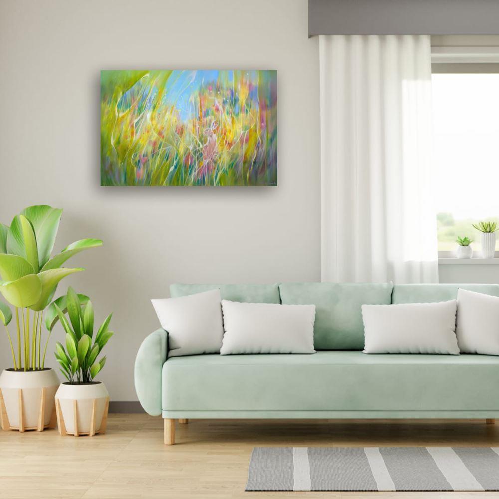 Meadow Born is a semi-abstract exuberant wildflower meadow painting with a hare appearing in it. It is 36x24x1.5inches. The painting was made by building up transparent layers of paint and lots of art nouveau style brush strokes and flourishes. The hare was painted in such a way as she looks ethereal and intransient. The inspiration is simply how wonderful spring time is and how fast it goes. The hare is best spotted in springtime so she fits ephemeral nature of the season. This is joyful painting and will enhance almost any room it eventually lives in. Painted on deep edge canvas, light green edges, no frames needed, ready to hang and comes with certificate of authenticity.