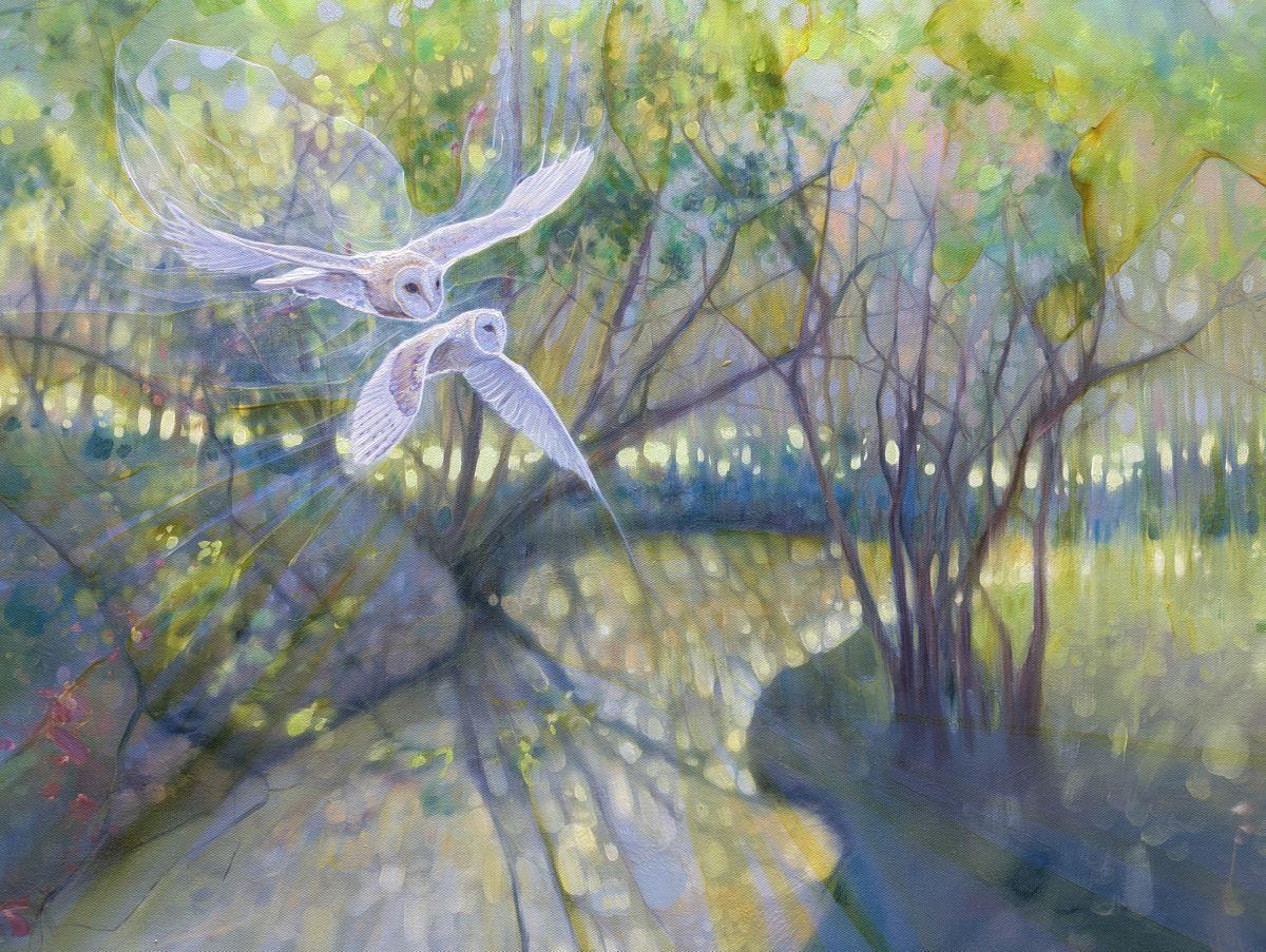 The Glade Portal is a very large oil painting of a springtime woodland glade with a river, barn owls, blossom and trees. It is 60x36x1.5inches. The painting shows the view across a shallow river with a meadow beyond gleaming through the trees at the edge. Two pale barn owls are flying across it looking as if they just escaped from somewhere else (hence the tile). There is a hint of blossom and bluebells and the luminous colours of springtime in England. The painting was originally inspired by a walk I took in the High Weald of Sussex where there are many forests, woodlands, streams and hills. There are always surprises around every corner and it is not hard to feel you are a fairy tale sometimes. This painting has a unique atmosphere to it and the colours change in interesting ways depending on the light. Painted on deep edge canvas, white edges, ready to hang and comes with certificate of authenticity