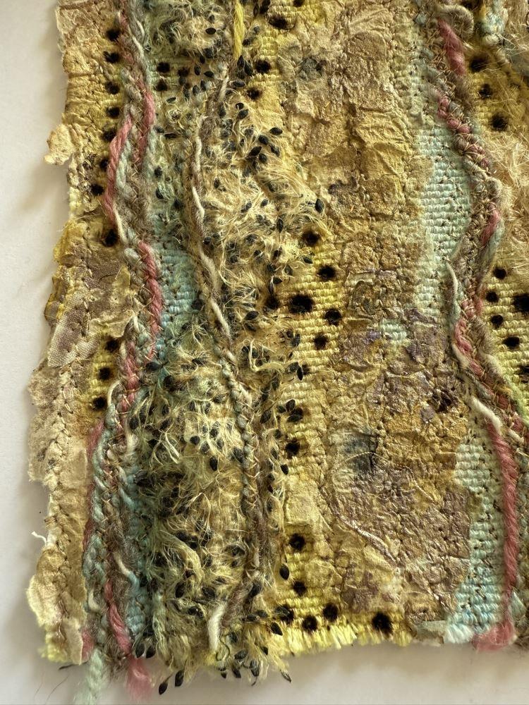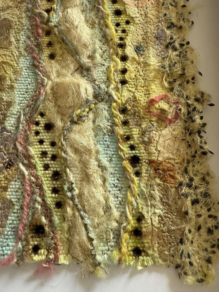 A fusion of upcycled textiles, yarn and eco paper embellished with tiny singed holes using a soldering iron. It comes in a black MDF glazed box frame so that its myriad of textures can be appreciated.