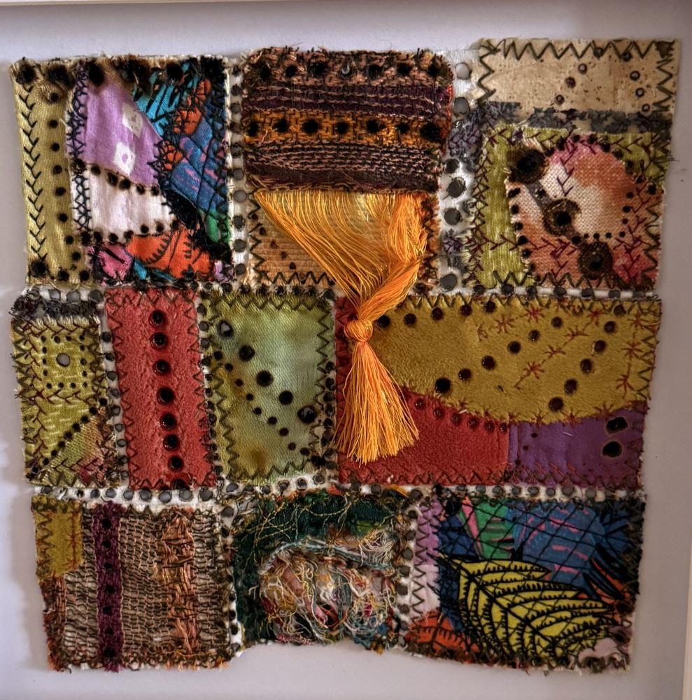 This unusual patchwork of upcycled fabric is stitched, melted and singed. It includes a tassel from a discarded tablecloth from India, some used tea bag paper and tangle weave which Ginny creates by sewing threads and minute scraps together to make a sheet of unique fabric. It comes in a white MDF glazed box frame, which shows off its textures to best effect.