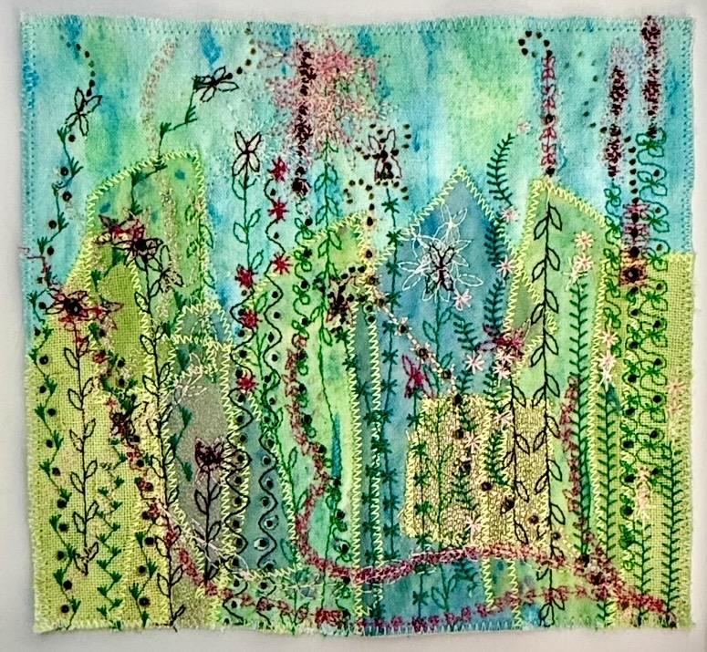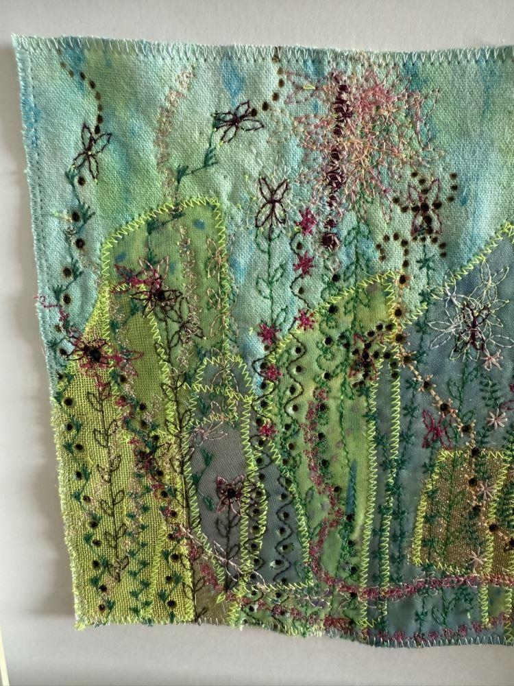 A pretty, but unusual artwork created by stitching and burning upcycled textiles and embellishing with textile paint and dye