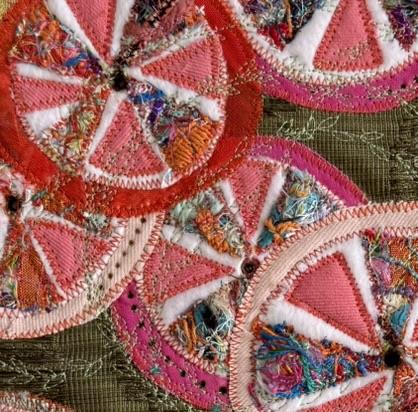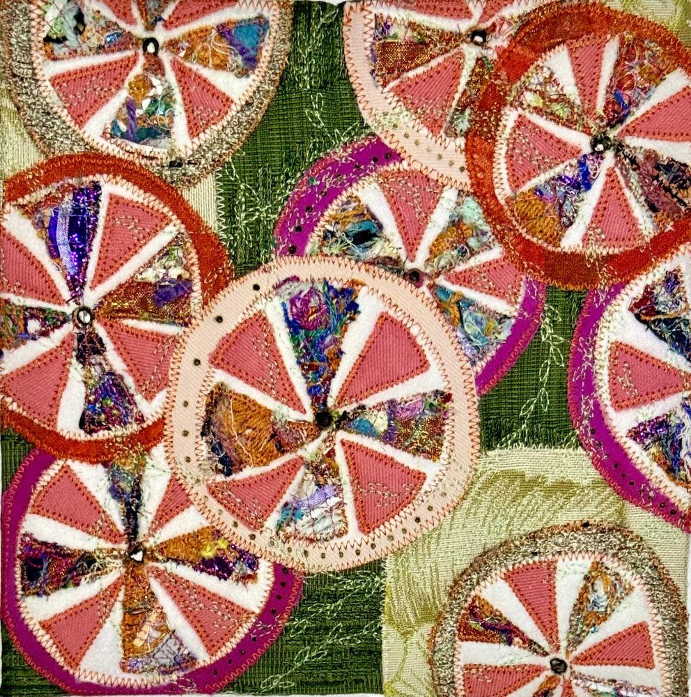 This is a unique piece created by upcycling textiles. This piece features 'tangle weave' which Ginny creates by sewing threads and minute scraps together to make a sheet of unique fabric. It is bright and cheerful and lifts spirits even on the dullest of days.