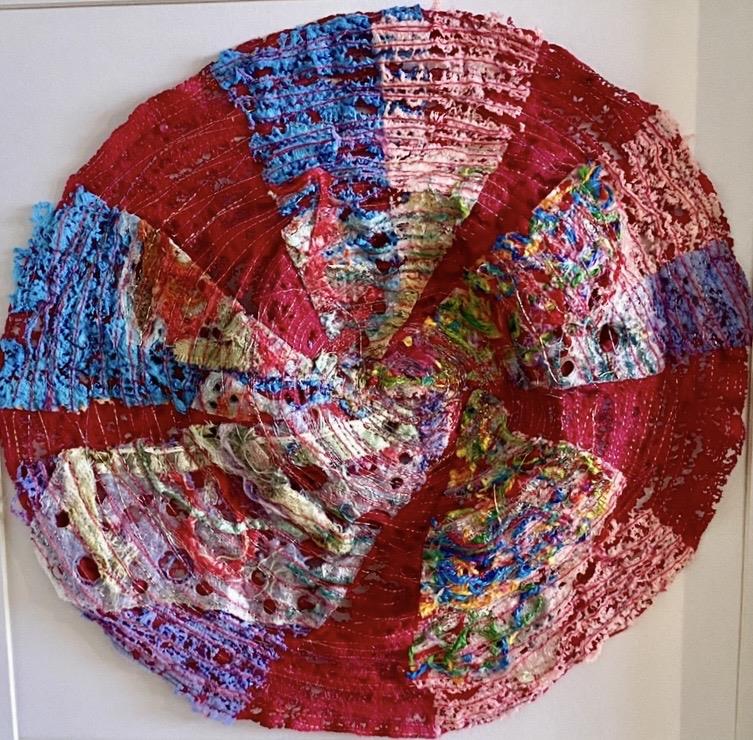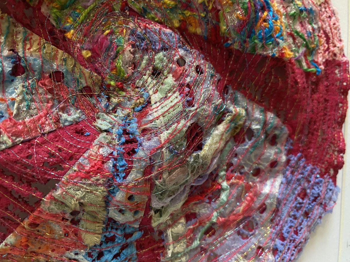 A circular metallic stitched piece resembling an unfairly cut cheesecake! Created by upcycling textiles, in particular 'tangle weave' which Ginny creates by sewing threads and minute scraps together to make a sheet of unique fabric. Ginny melts and burns the materials to get an unusual and unique texture and effect. It is presented in a grey MDF glazed box frame which shows off the textures to best effect.