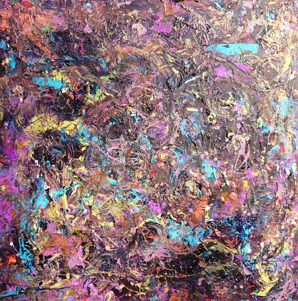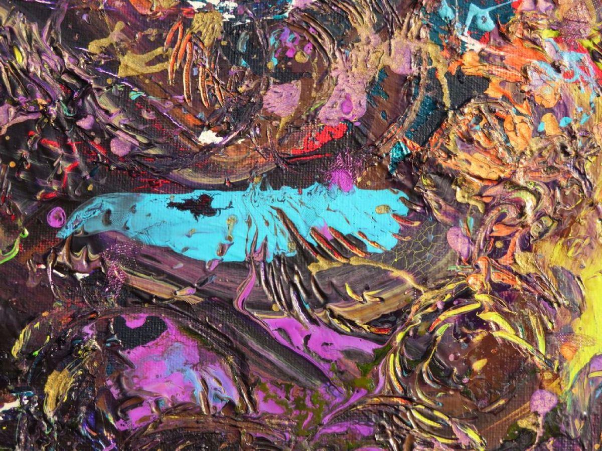 Mixed Media on Canvas (acrylic and enamel paint and mediums, glitter and re-used materials - silk)