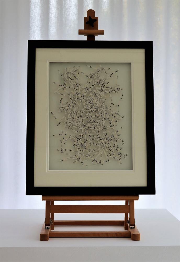 Shredded music has been randomly dropped and scattered between two sheets of glass and suspended over a cream card. The space between the glass and the card allows interesting shadows with different lighting.