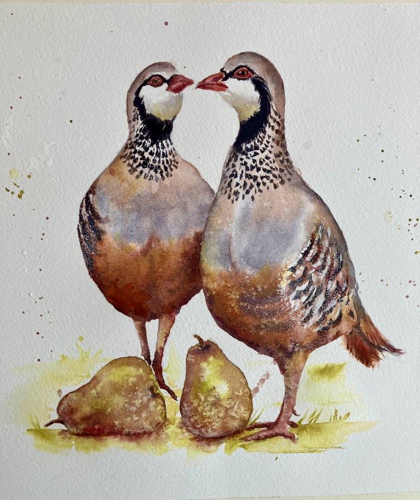 Two partridges and two pears , a take on the seasonal Christmas song, beautiful painting of British wildlife