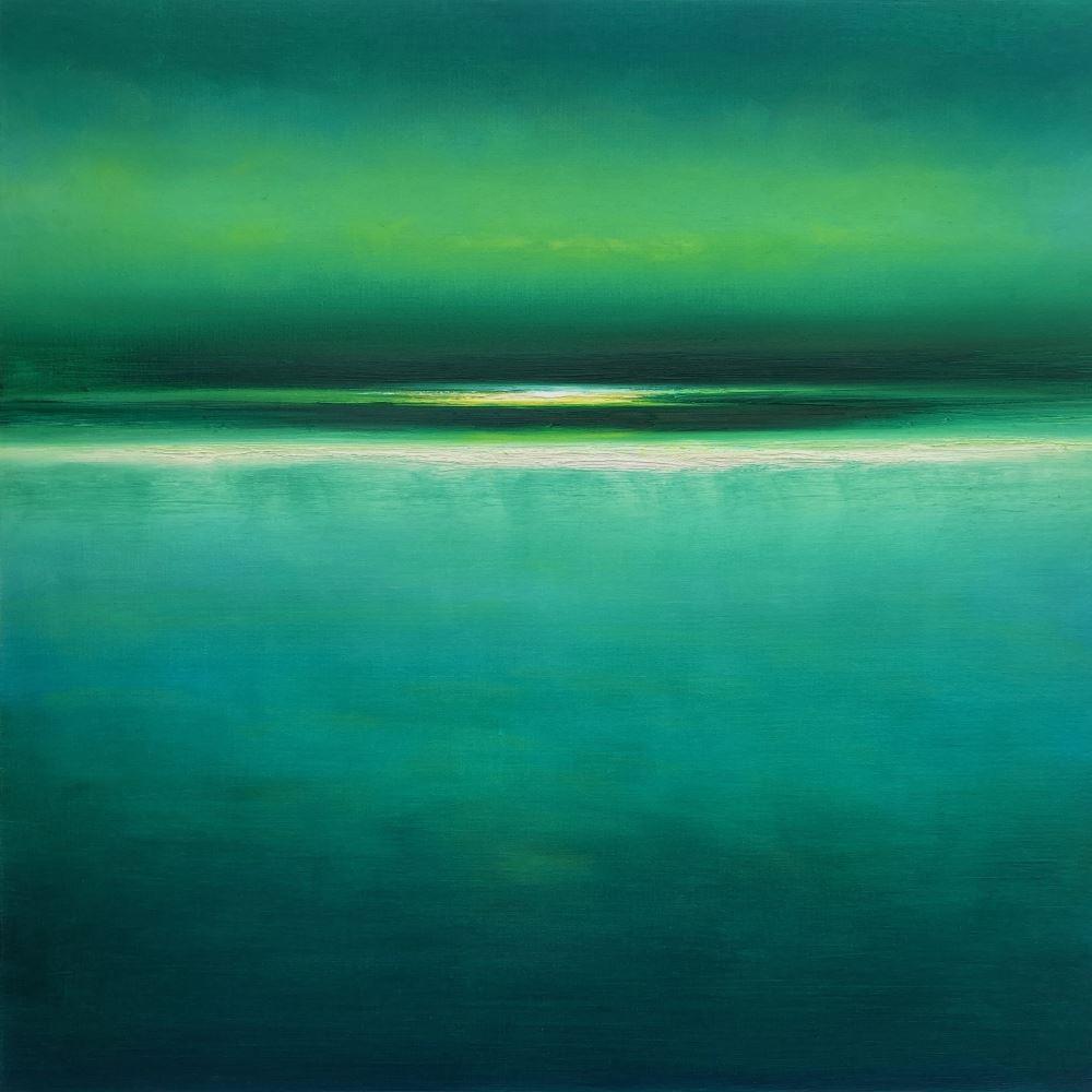 “High Tide and Green” is an ethereal abstract seascape oil painting 50cm x 50cm (20 x 20 inches) on 4cm (1.5 inch) deep canvas.