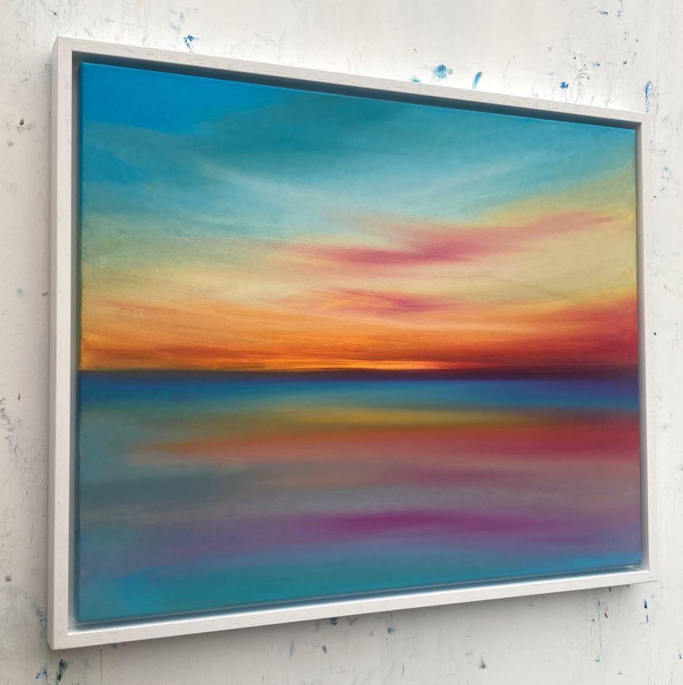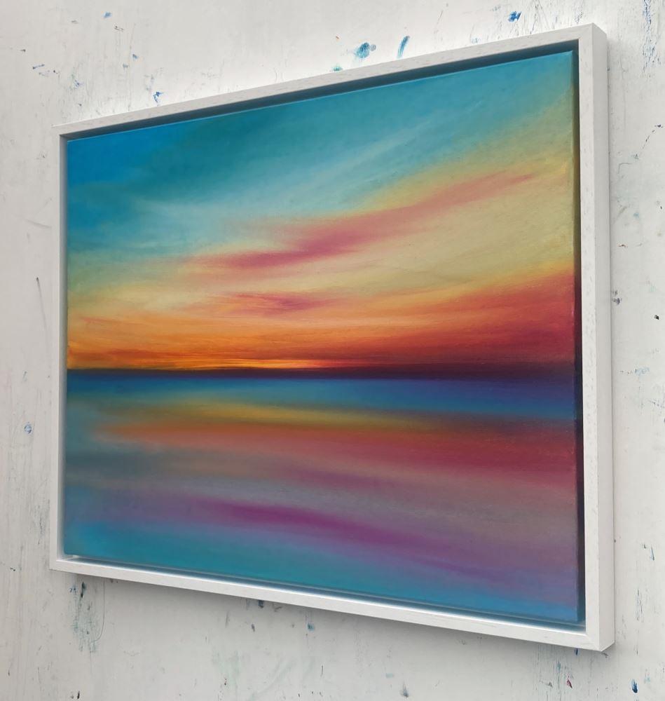 “Moments Just Fly" is a 40x50cm oil on canvas abstract seascape painting on a 2cm deep canvas, mounted in a 43x53x3cm white floating frame. It's ready to hang and comes with a certificate of authenticity.