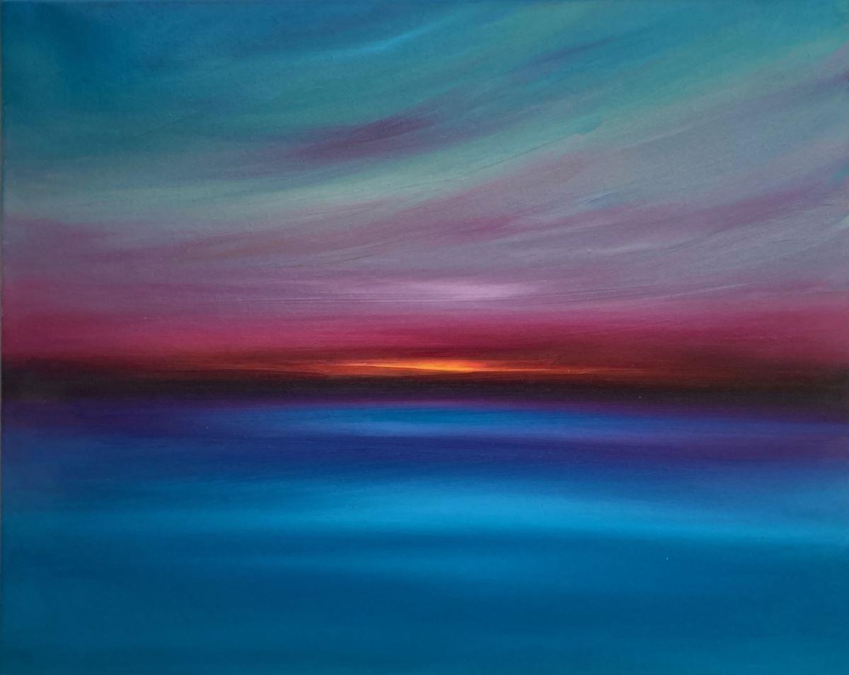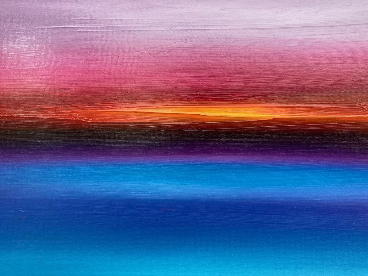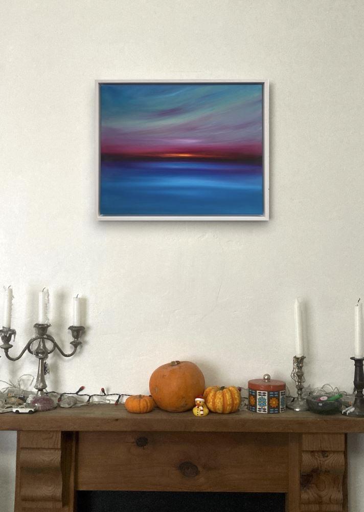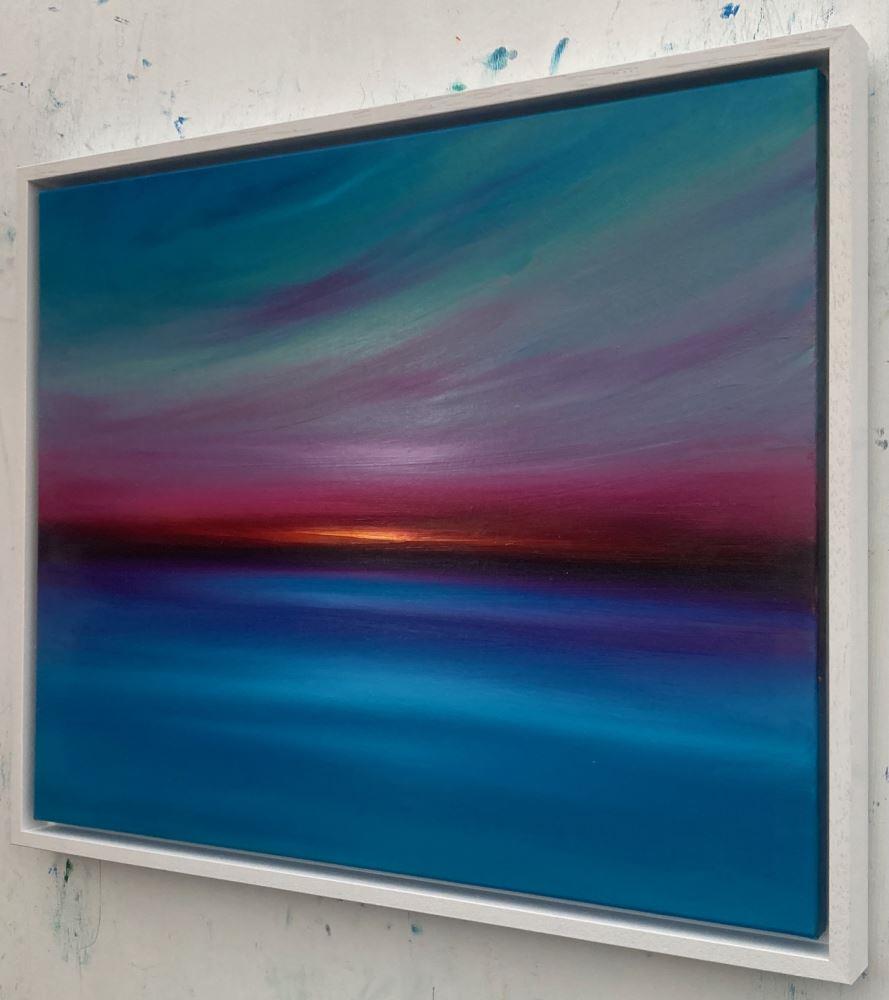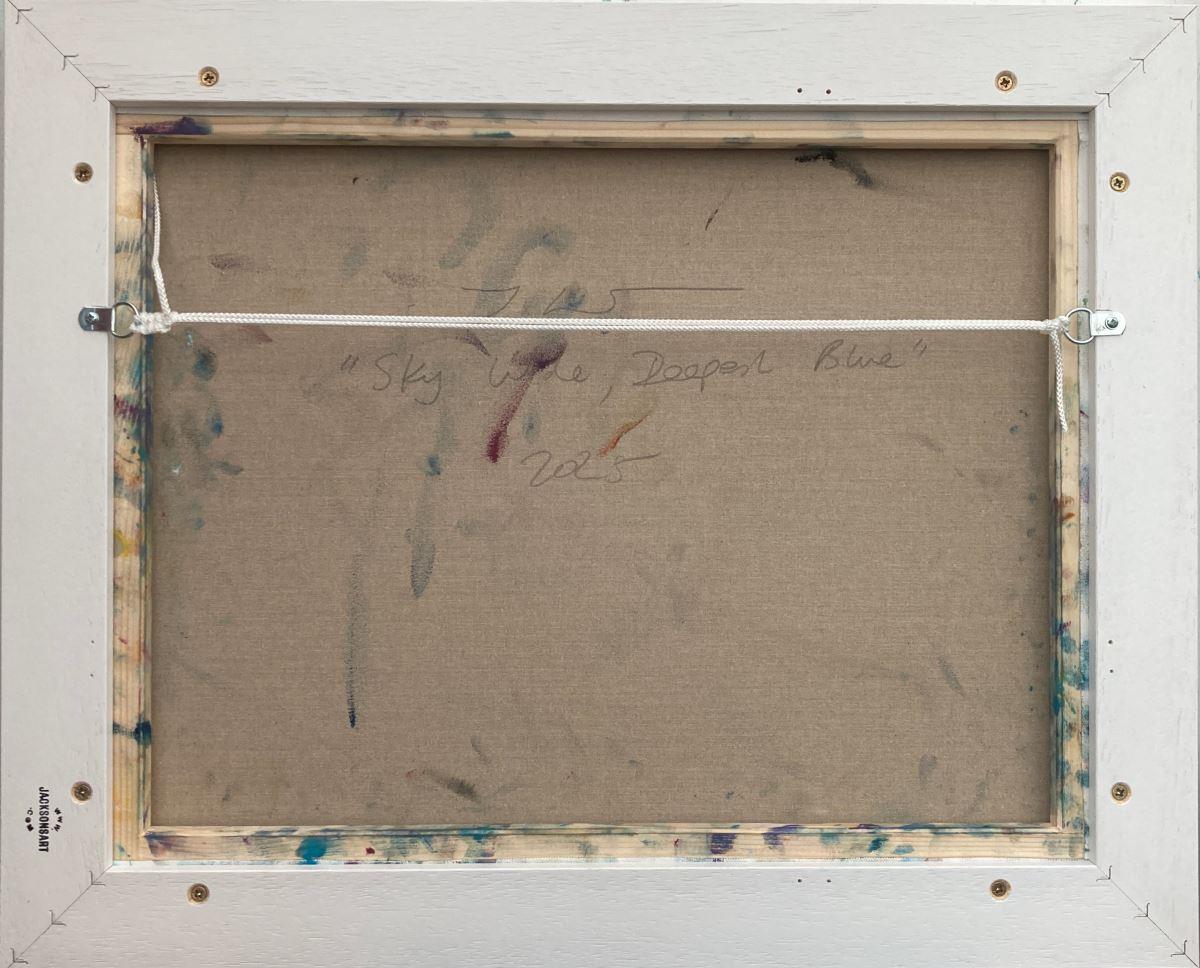 “Sky Wide, Deepest Blue” is a 40x50cm oil on canvas abstract seascape painting on a 2cm deep canvas, mounted in a 43x53x3cm white floating frame. It's ready to hang and comes with a certificate of authenticity.