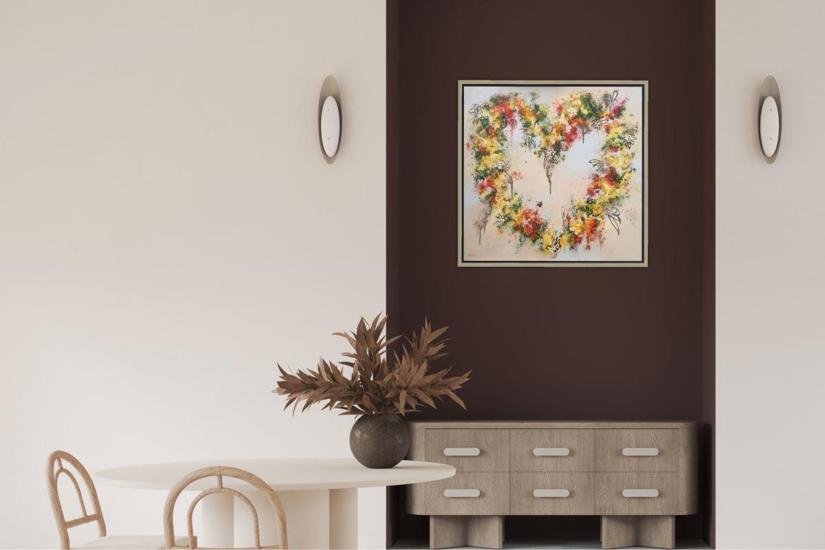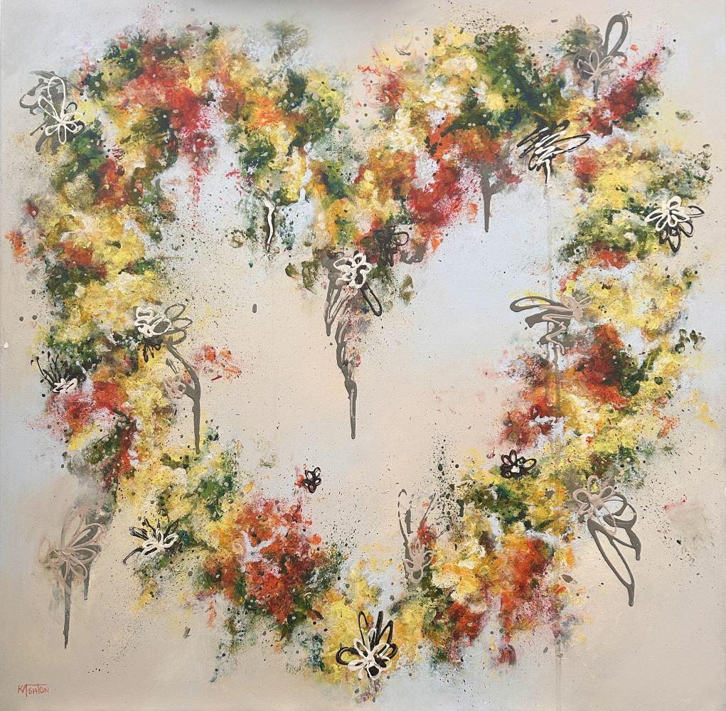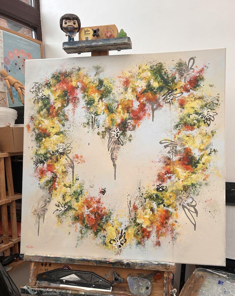 I have always loved hearts and have painted many in the past, however, A GROOVY KINDA LOVE is the first one using my fingers; an intuitive technique whereby the paint feels its way across the canvas in a loose, abstract fashion. Through each layer the leafy greens along with the vibrant orange and yellow flowers appear, creating the beloved symbol of love whilst allowing the blooms to evolve organically.