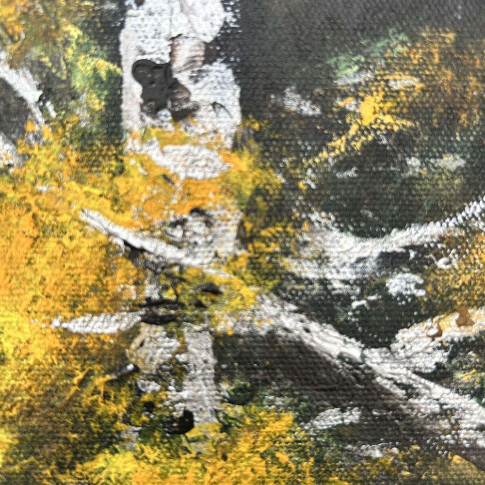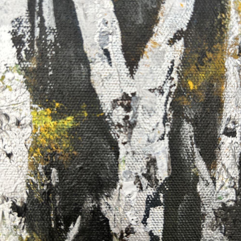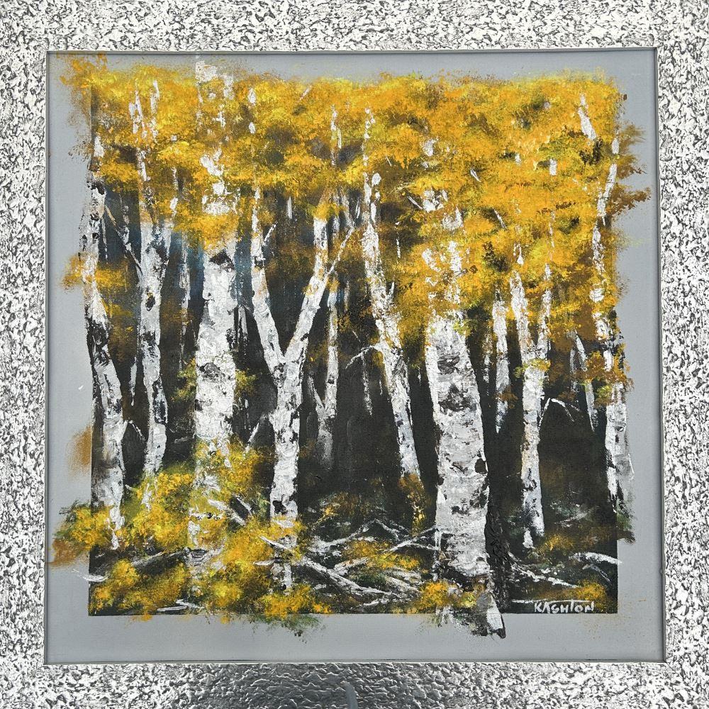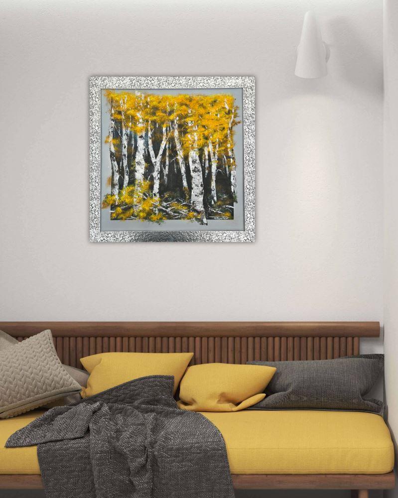 Palette knife textured acrylic painting of autumn silver birches. This piece comes framed in a sturdy textured silver moulding.
