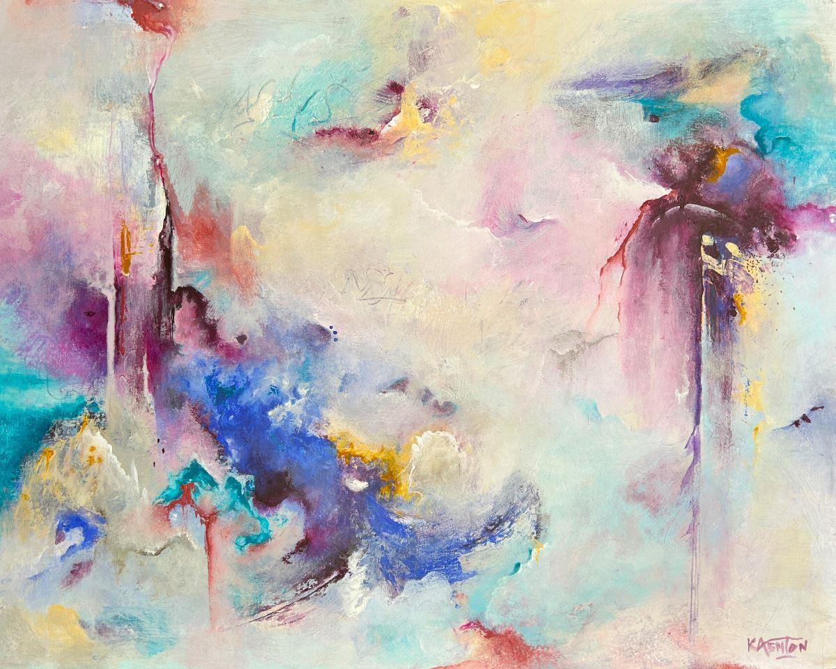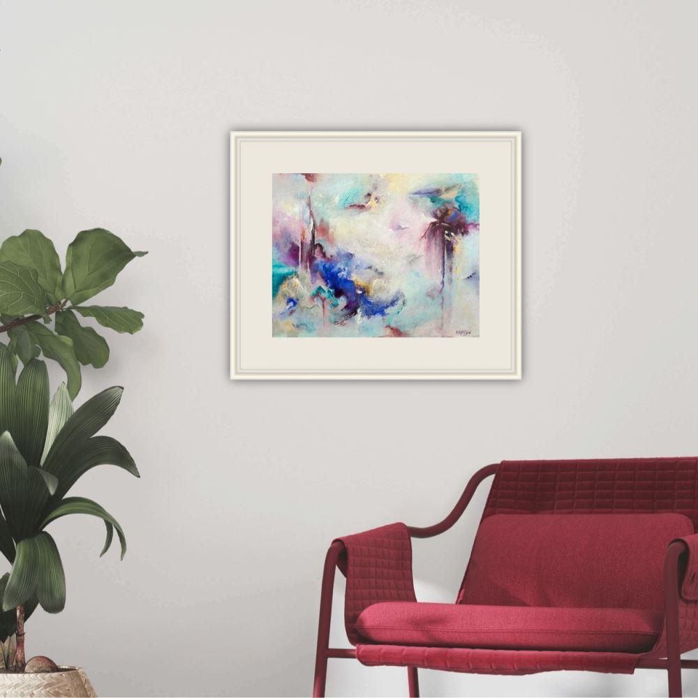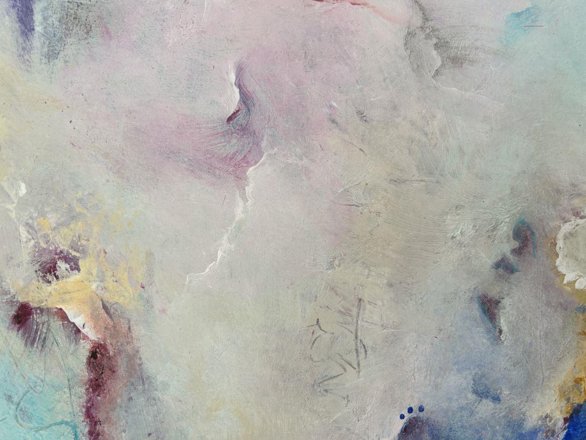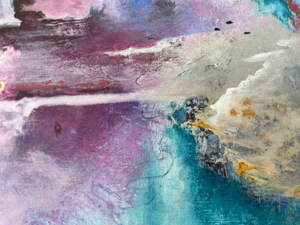 Dreamy abstract piece in beautiful muted purples, pinks and turquoise.