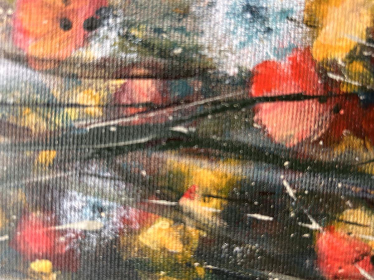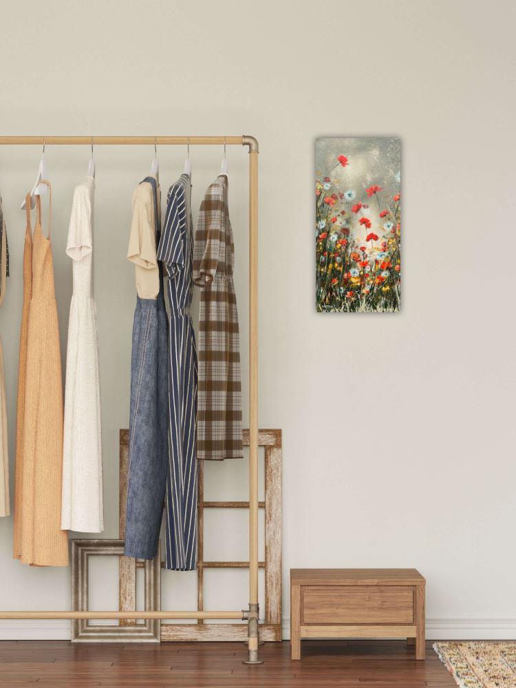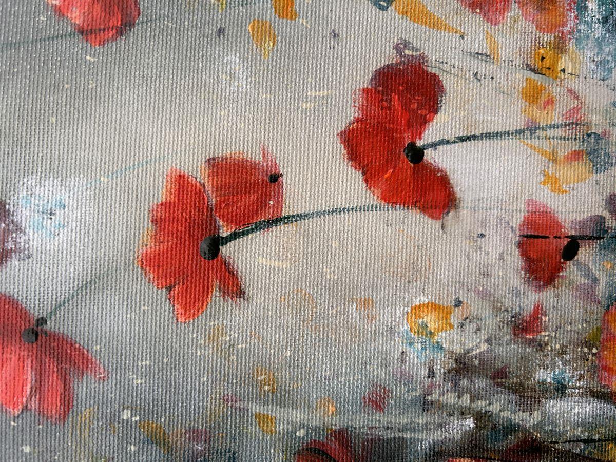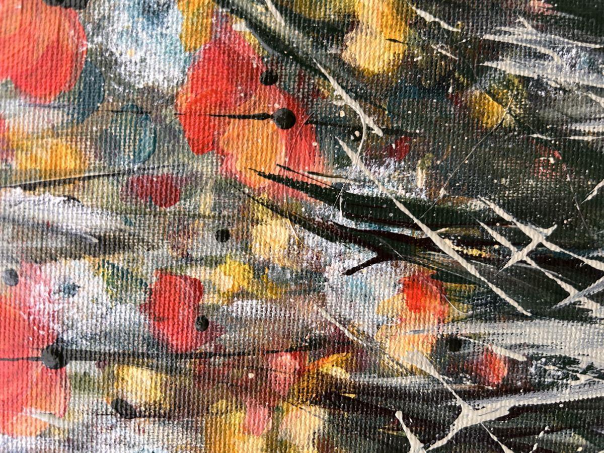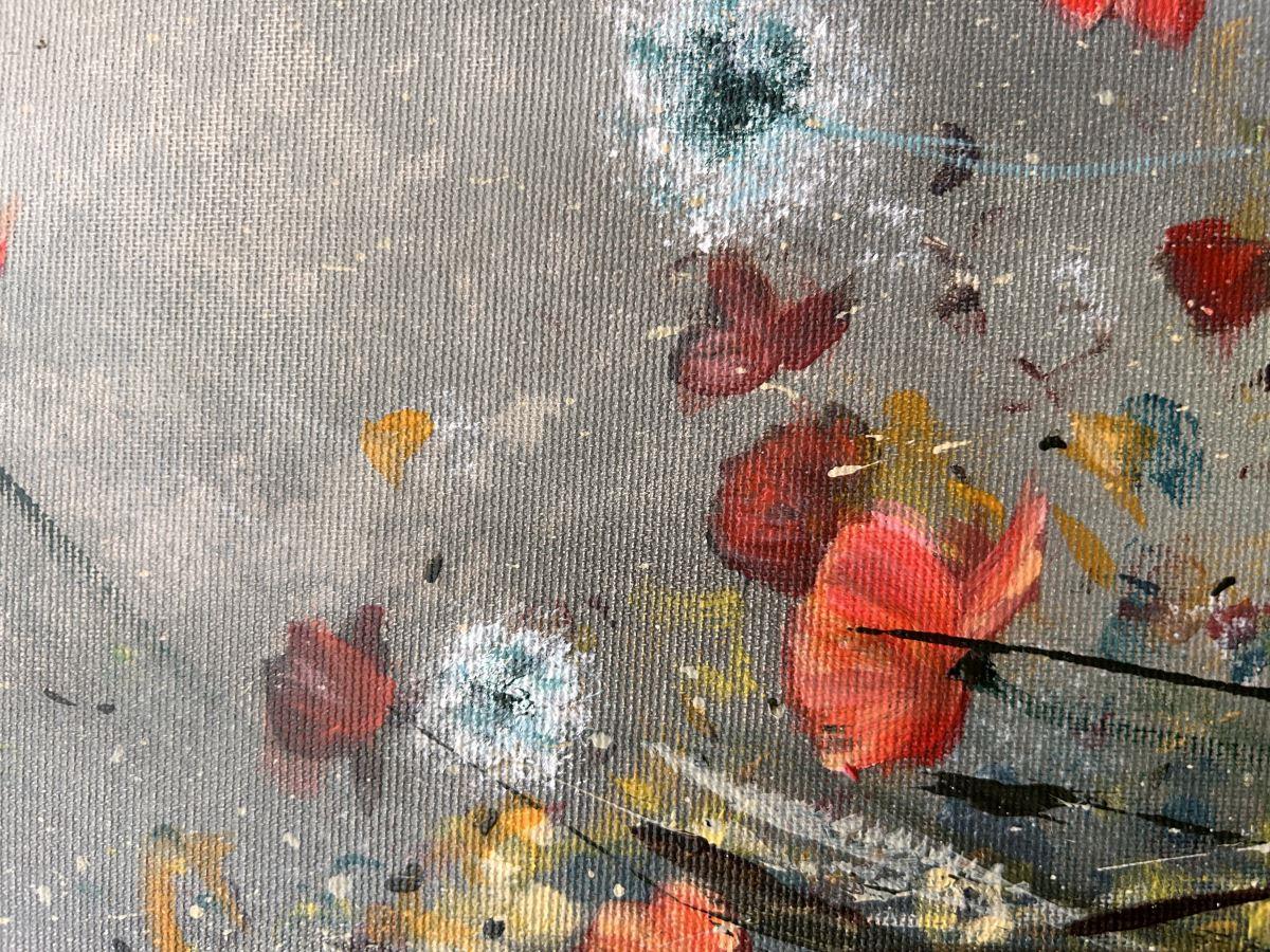 FIRST LIGHT was created with an array of tools from brushes, bottles and fingers (an intuitive technique whereby the paint feels its way across the surface in a loose, abstract fashion). Through each layer the colourful wildflowers emerge, creating movement and unpredictability, allowing the painting to evolve organically.