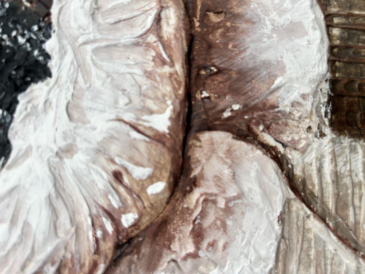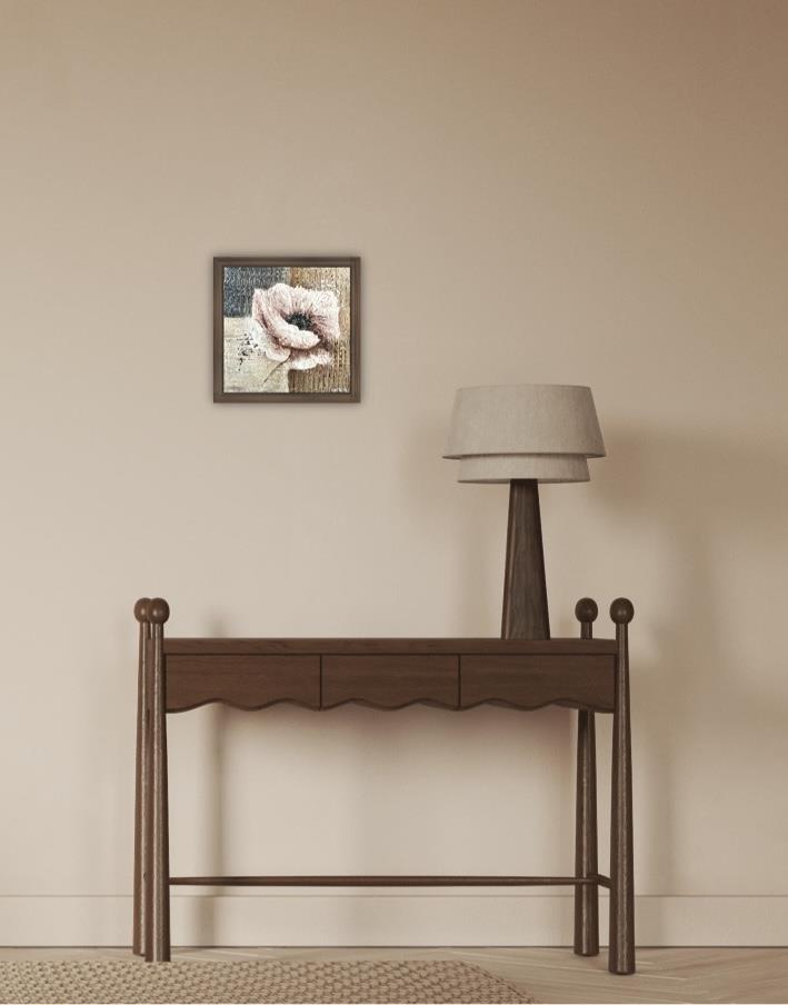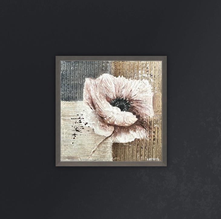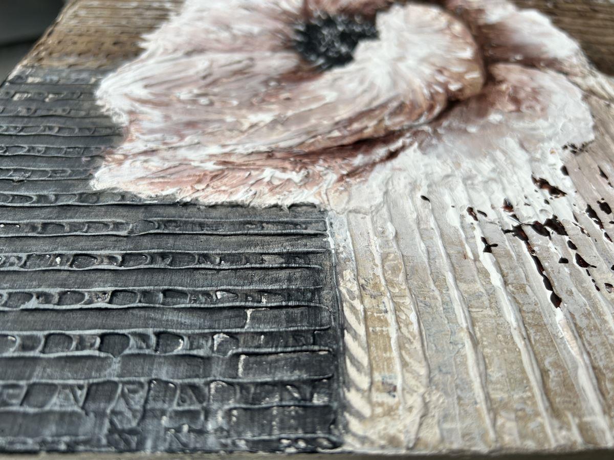 A tactile, abstract piece in neutrals created with palette knives and joint compound (a sort of moulding plaster) which makes for wonderful texture. The loose, flowing petals of the poppy stand out against the rigid geometric background; all wonderful to the touch.