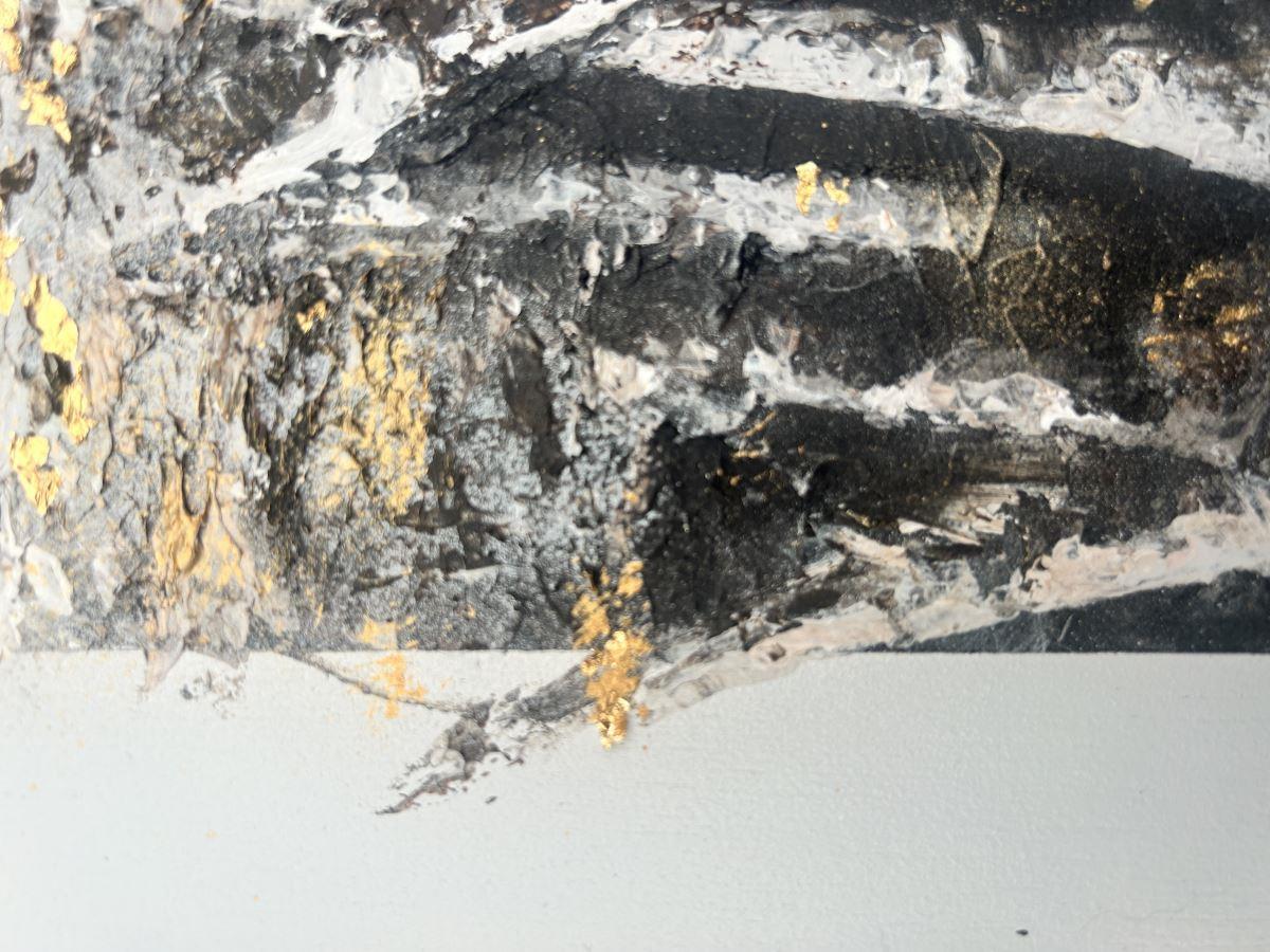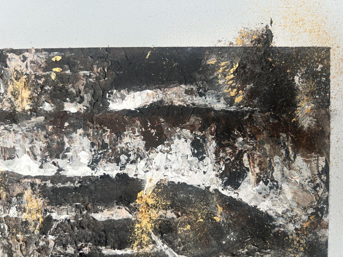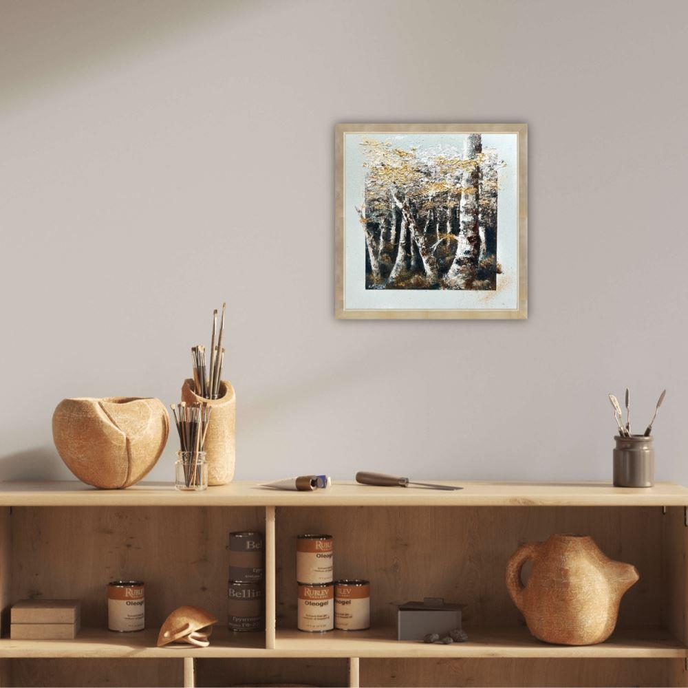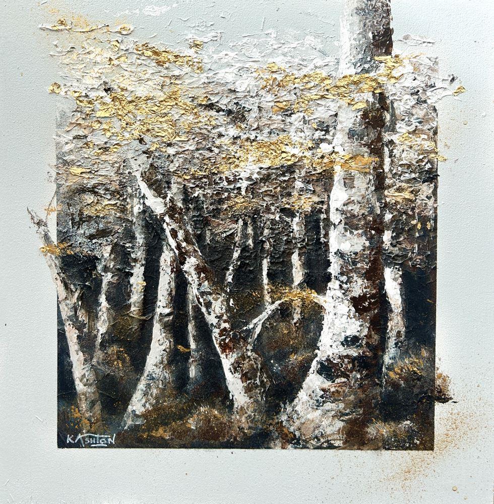 If you have a small space to fill, then this small textured acrylic painting of birch trees in monochrome tones with luminous gold leaf might just fit the bill.