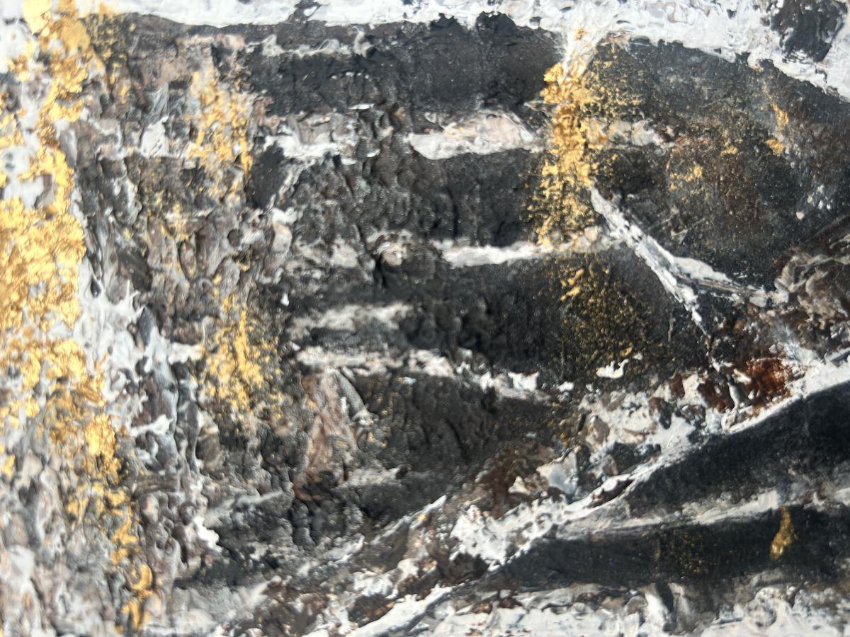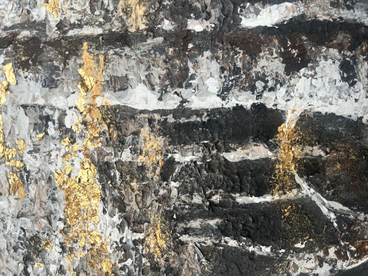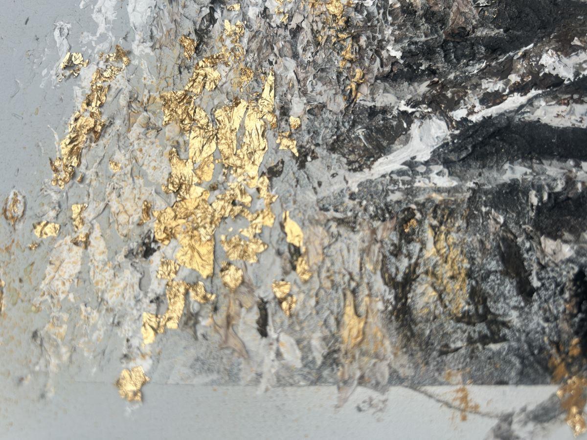 If you have a small space to fill, then this small textured acrylic painting of birch trees in monochrome tones with luminous gold leaf might just fit the bill.