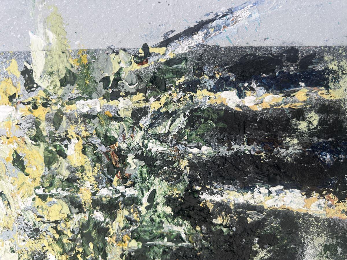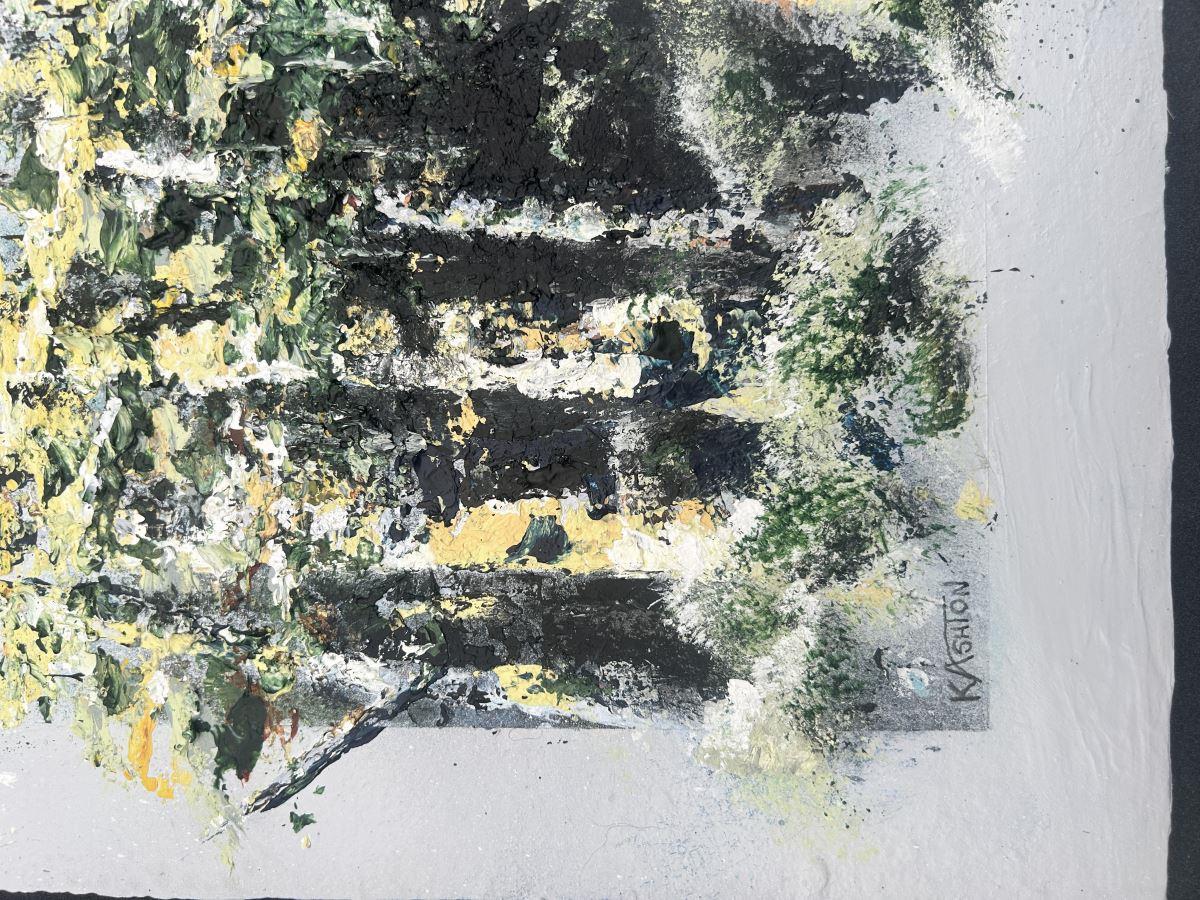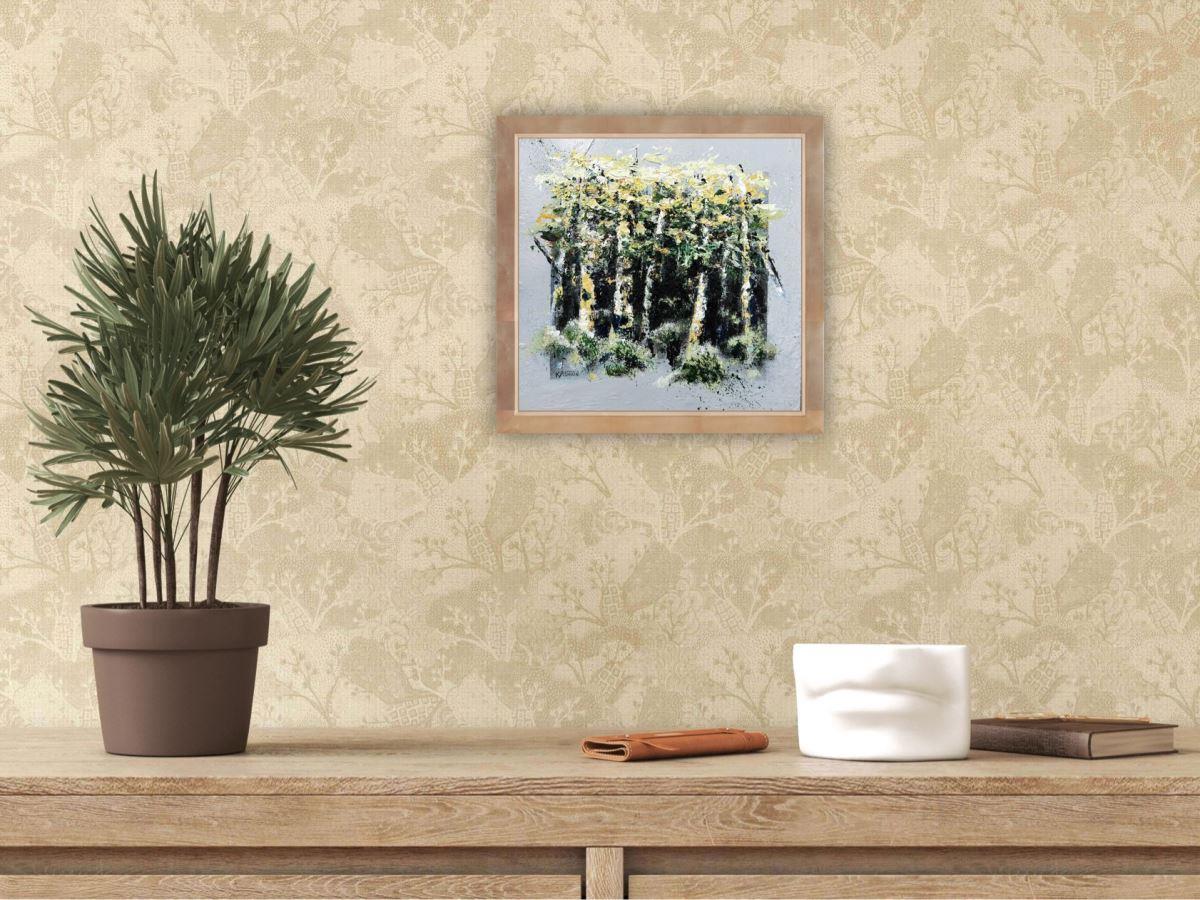 If you're looking for a miniature piece to fill a small spot, then this small textured acrylic painting of spring birch trees might be just what you're looking for. As well as the texture created with the palette knife, there is subtle texture around the incorporated 'frame' for added interest.