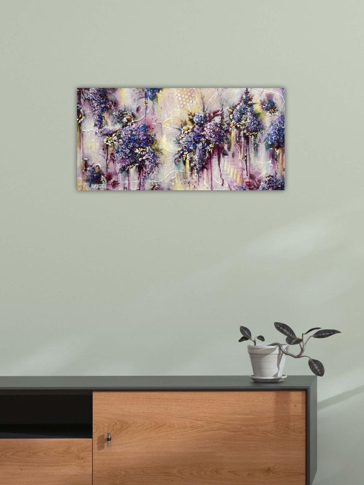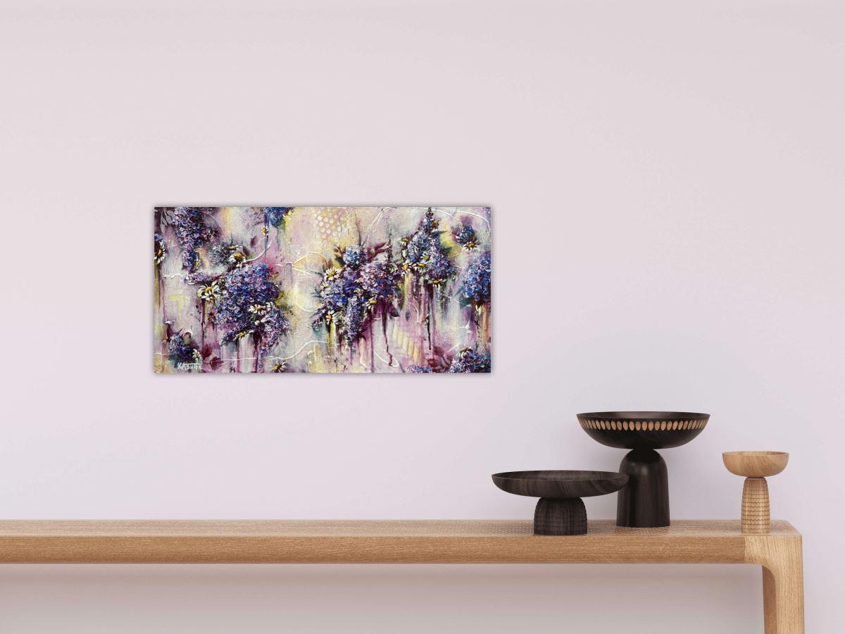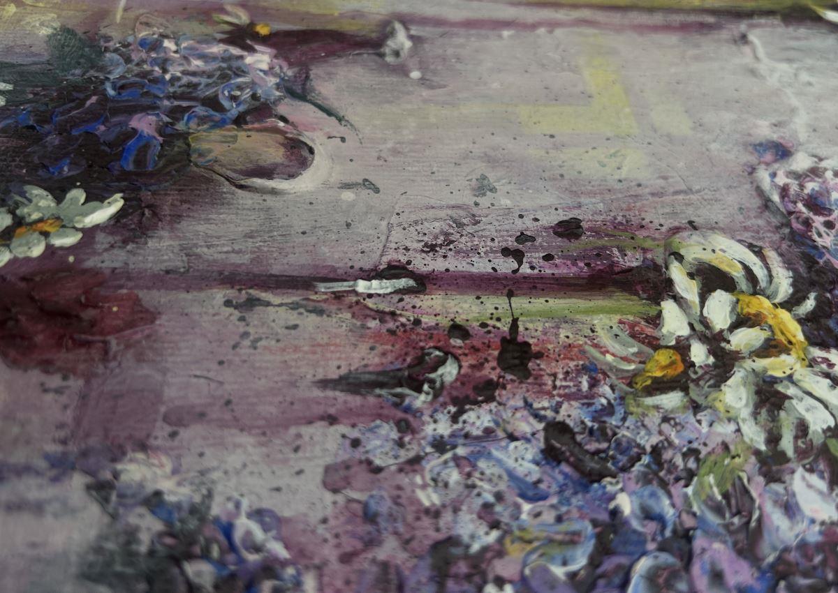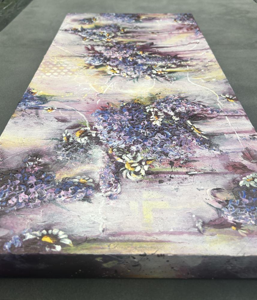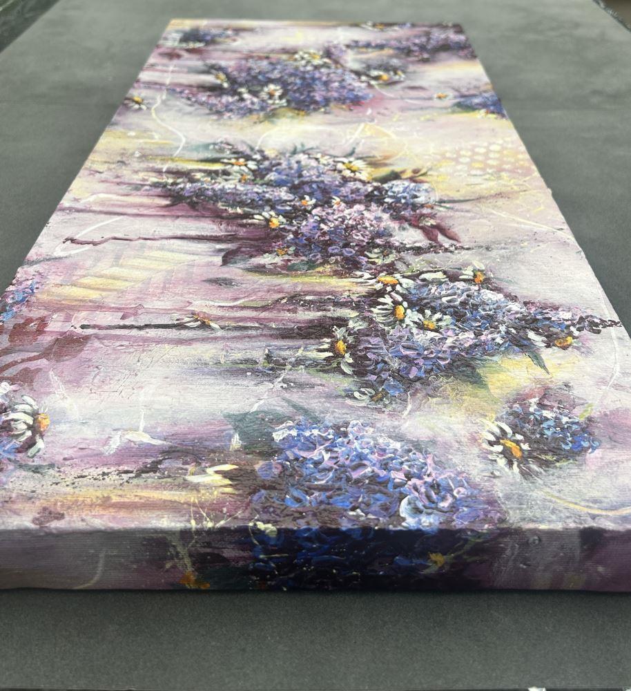 Textured semi-abstract lilacs and daisies in beautiful blues and purples, lilacs and yellows created with palette knives on a small panoramic box canvas. Aside from the eye-catching blooms, there's some subtle textures going on in the background, adding further interest to the piece.
