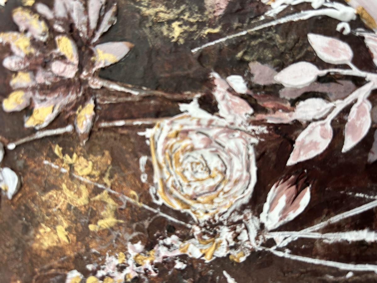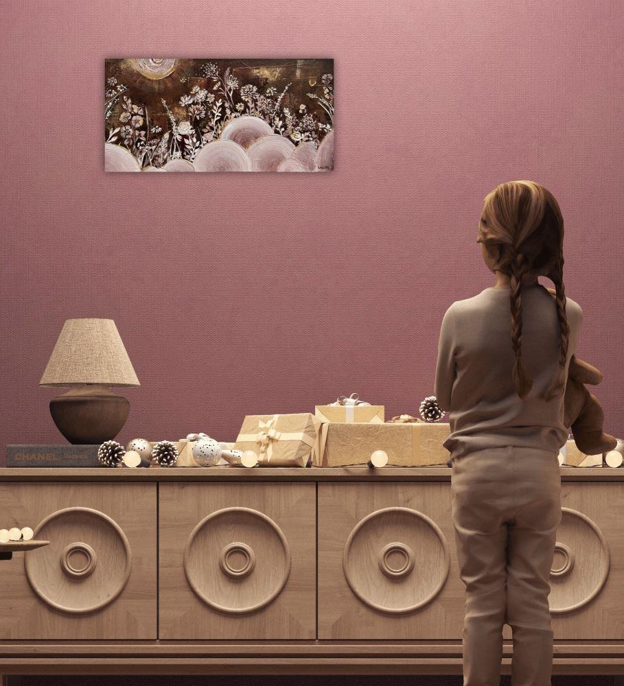 A wide semi-abstract landscape painting in mixed media in dusky pinks, warm browns and bronze. I liked the idea of textured flowers over the hill, catching the sun and generally living their best lives together.