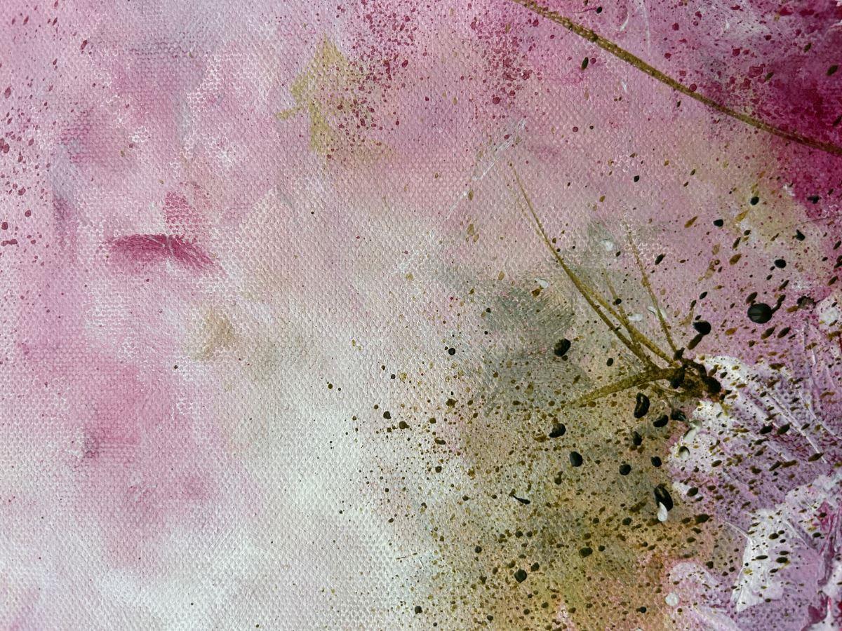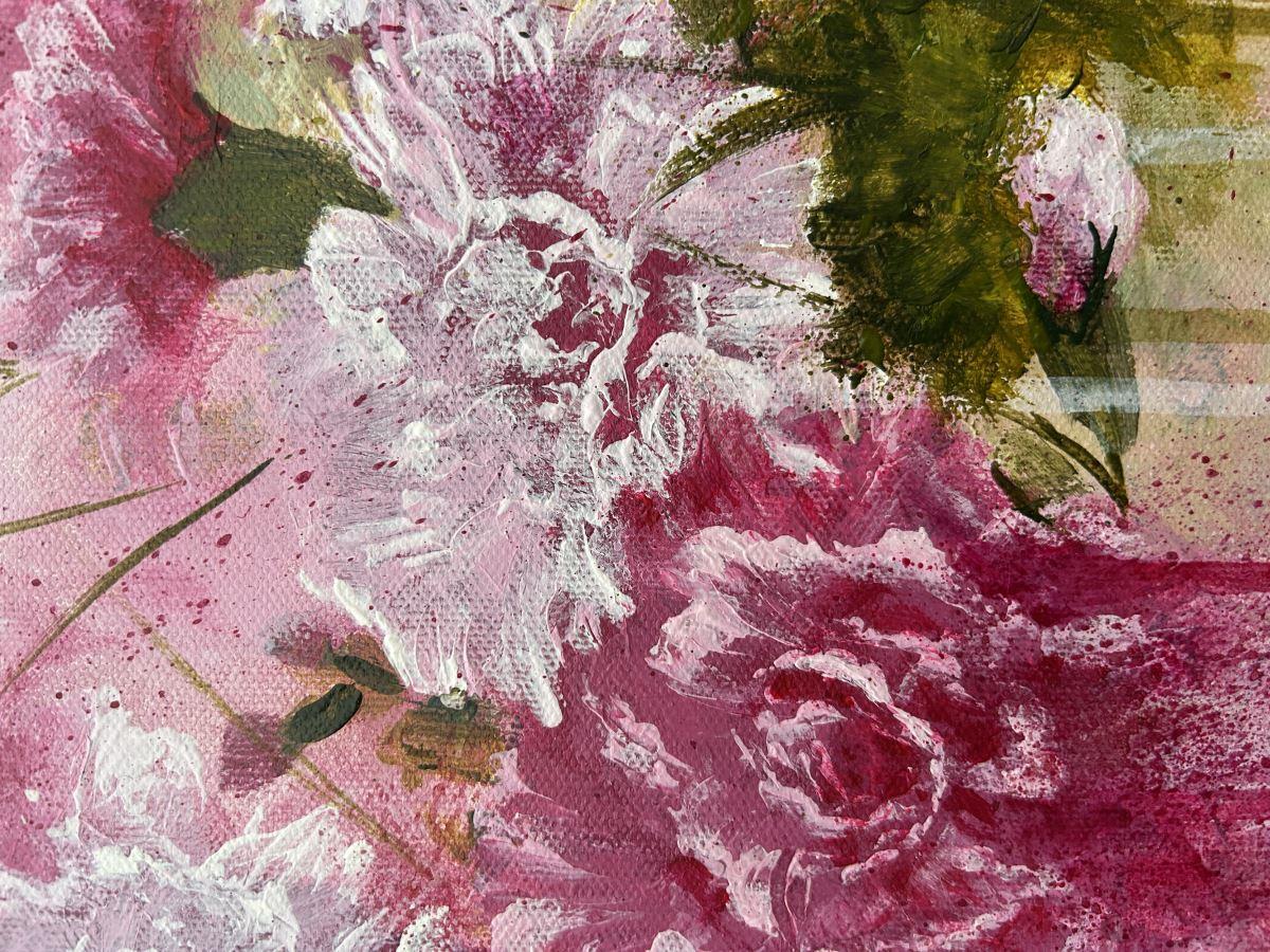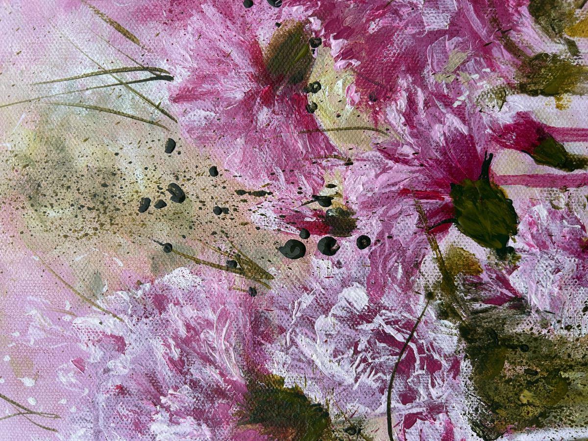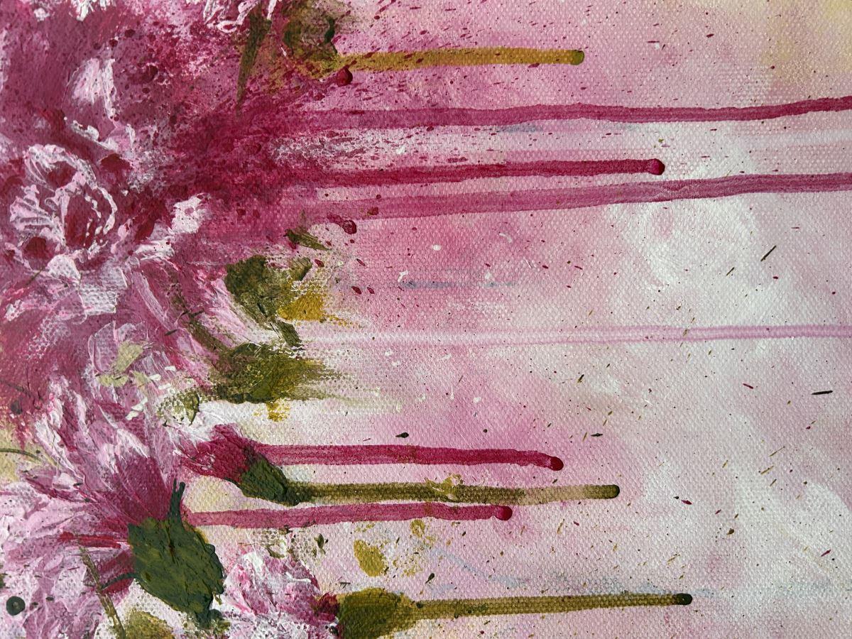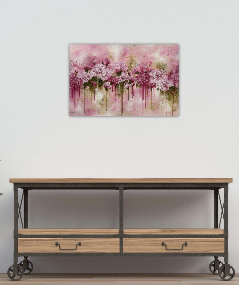 Tickled Pink is a painting that was created using a multitude of tools including silicone brushes and my fingers. I allow my intuition to lead the way during this organic process and as layer upon layer is added, my fingers dance and swirl all over the canvas. This large semi-abstract piece celebrates the humble carnation which is one of my favourite flowers. I would surround myself with these blooms if I could and always have a vase of them nearby. They are so beautiful.