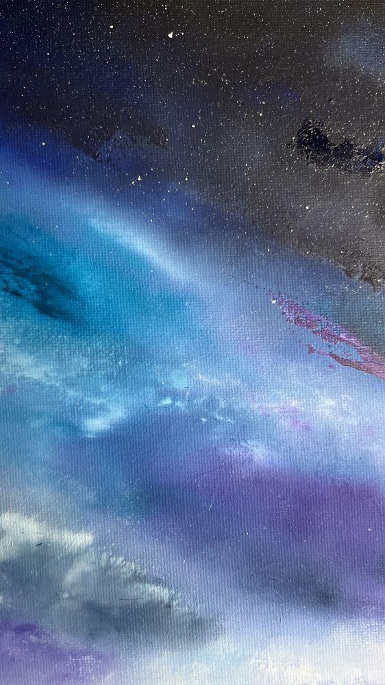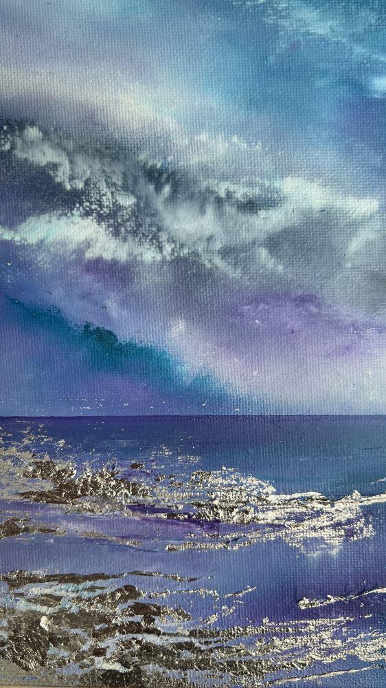 Celestial Dreams is a small oil painting that explores the liminal space between seascape and cosmos. The composition present a quiet horizon where expansive and atmospheric skies dissolve into a tranquil body of water, rendered in layered tones of deep indigo, ultramarine and soft violet.