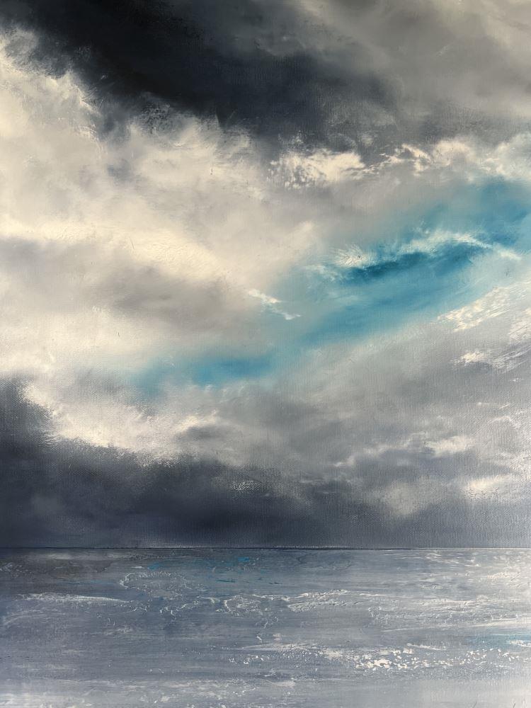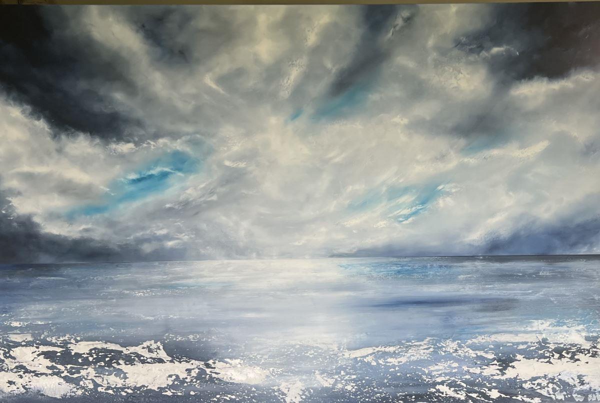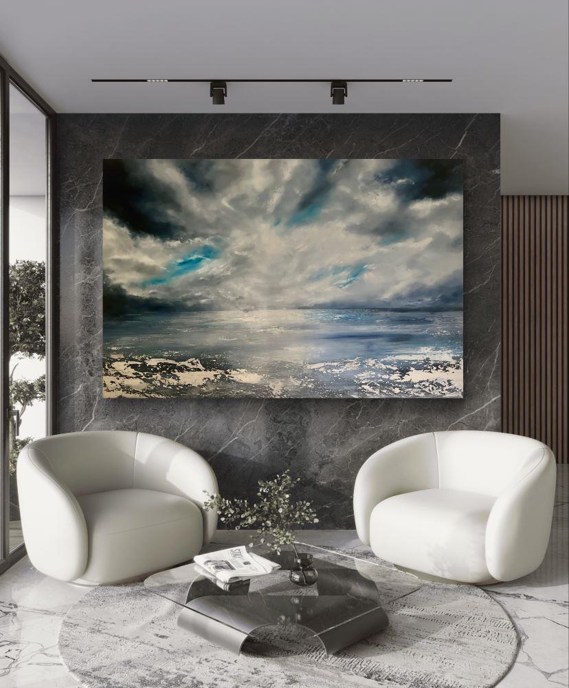 clouds illuminating the stormy backdrop. Deep navy hues,