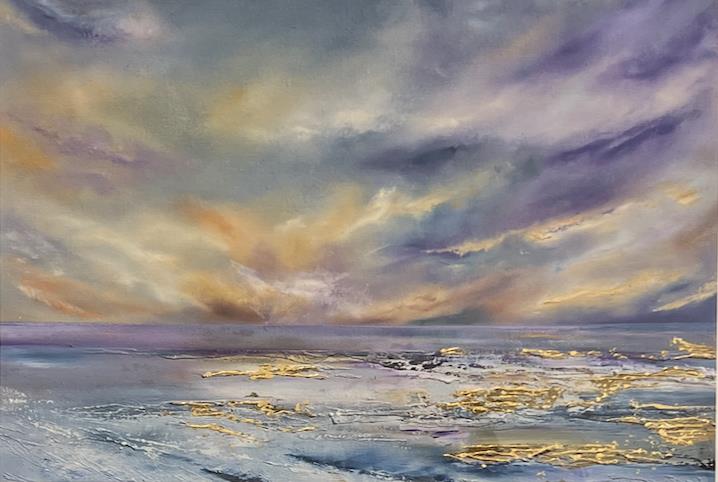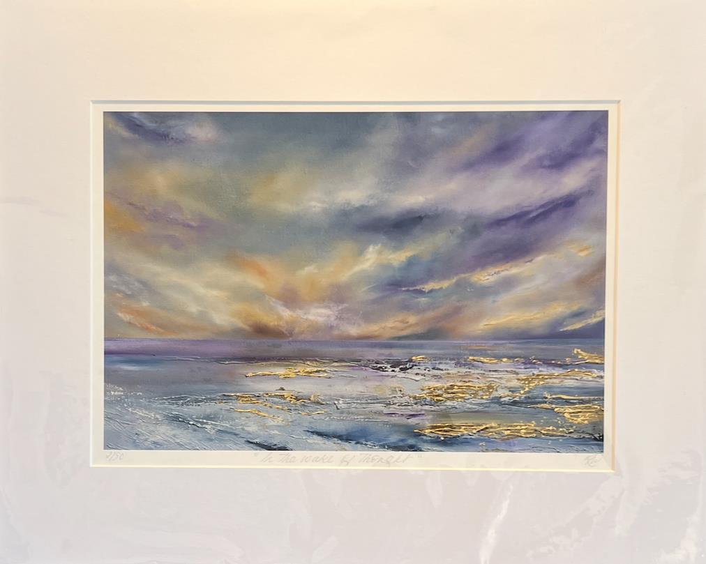 This mounted hand-embellished print invites you into a serene shoreline moment, where the ebb and flow of the tide mirrors the gentle drift of the mind. Soft hues and fluid brushstrokes create a contemplative seascape, while delicate touches of vintage gold leaf catch the light, adding a timeless warmth to the scene. The interplay of texture and shimmer enriches the sense of tranquility, making this piece a visual echo of thoughts and feelings suspended in time.