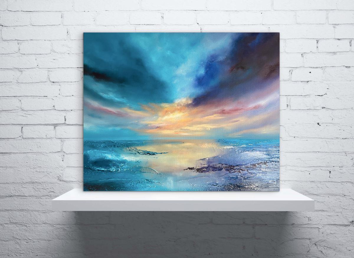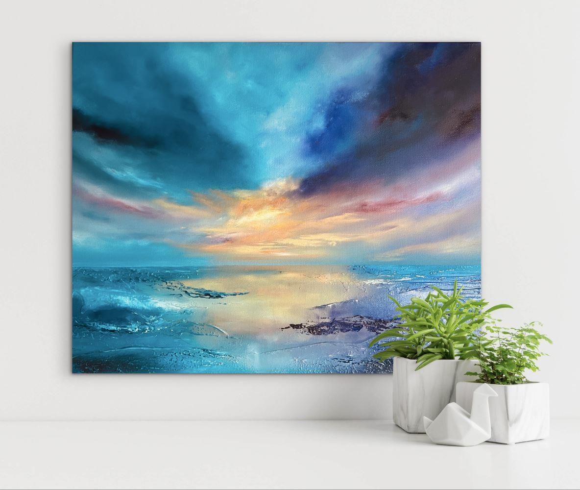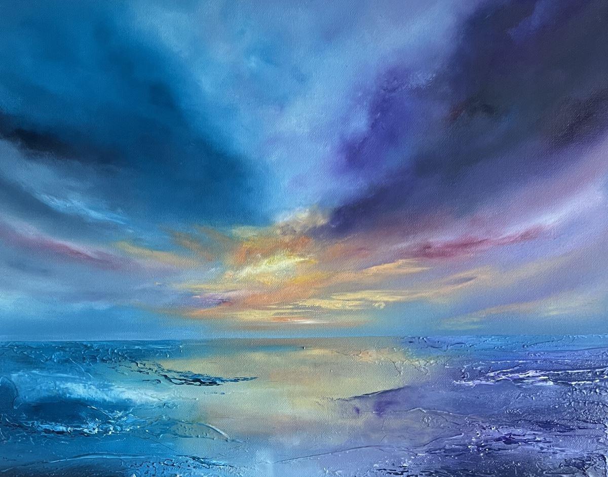 Soft gradients of turquoise, violet, and blush tones sweep across the canvas, suggesting the fragile transition between day and night. These tactile elements catch and reflect light, giving the painting a dynamic presence that evolves throughout the day.