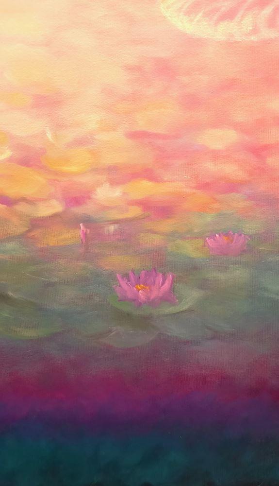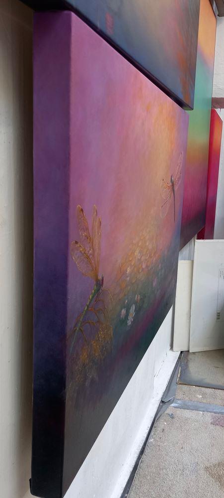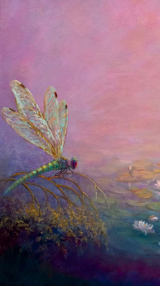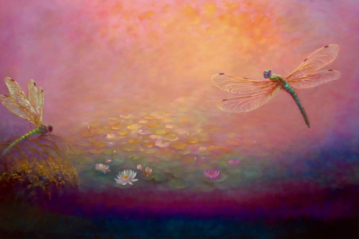 Two dragonfies with waterlilies on a pink/gold impressionistic background. Metallic pigments on wings and foliage.