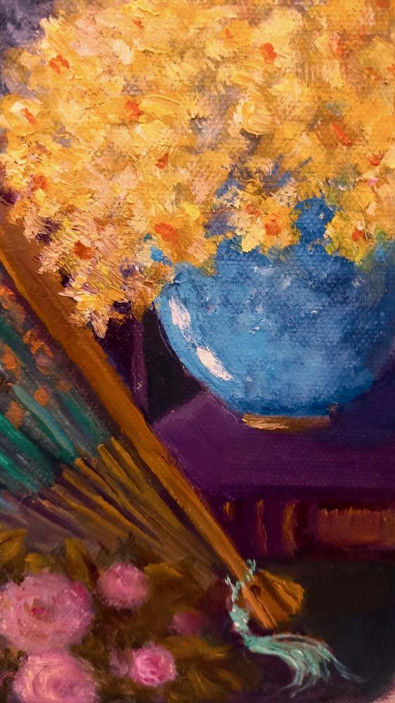 A dance of time and tranquility. Using rich oils, symbolising moments of reflection—a vintage clock, soft flowers, and an elegant cup evoke nostalgia and serenity. I wanted to bring a warm, peaceful energy to your space, inviting calm and contemplation through every brushstroke. This piece transforms any room into a quiet sanctuary where time feels beautifully suspended. Silvery metallic edges which continue around the sides so no frame required.