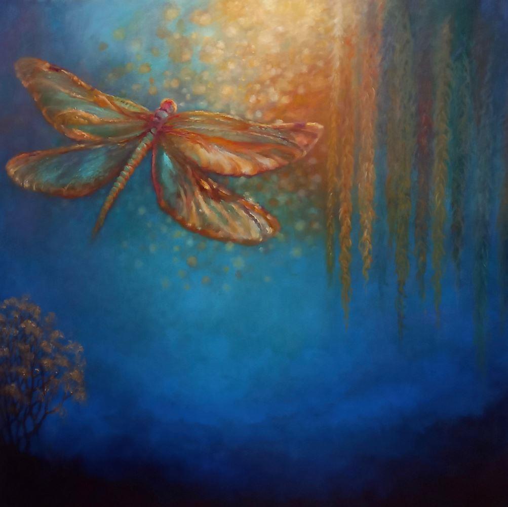 Dragonfly on gold and blue background with pond plant in corner and willow fronds. The luminous dragonfly symbolizes fleeting beauty and fragile strength, illuminated by warm light that shimmers like a dream. Suggesting energy and gentle inspiration, reminding you of the magic in every moment and the power of quiet grace. Dragonflies are symbolic messengers. Metallic pigments used throughout and metallic gold around the deep edges.