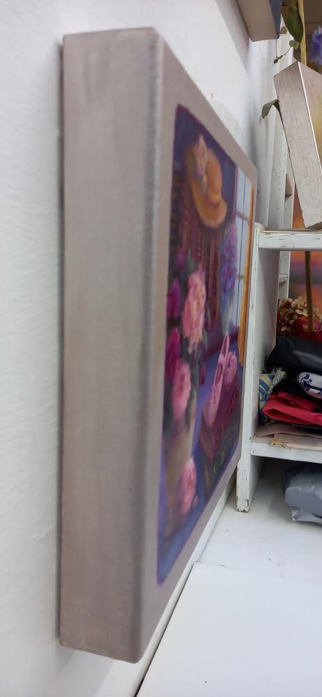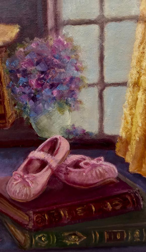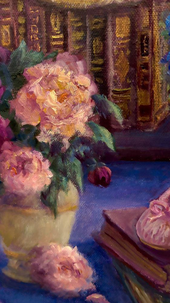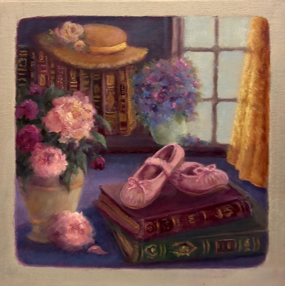 A peaceful reflective still life with a straw hat and tiny pink ballet shoes resting on antique books framed by a gold lace curtain with a vase of peonies. Metallic silvery edges which continue around the edges so no frame required.